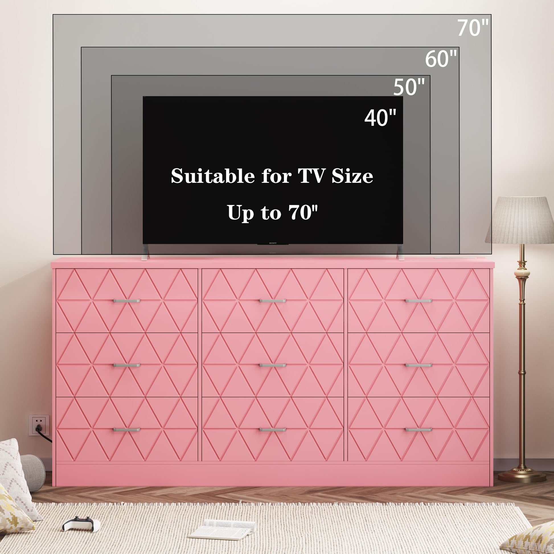 - Versatile Large Dresser: Measuring 63"W x 31.5"H x 15.7"D, this long chest of drawers is perfect for various living spaces, including bedrooms, closets, living rooms, hallways, and entryways. The large dresser not only provides ample storage for clothes, toys, and other supplies but can also serve as a vanity, TV stand, or display table. It's spacious enough to accommodate a 70-inch TV.