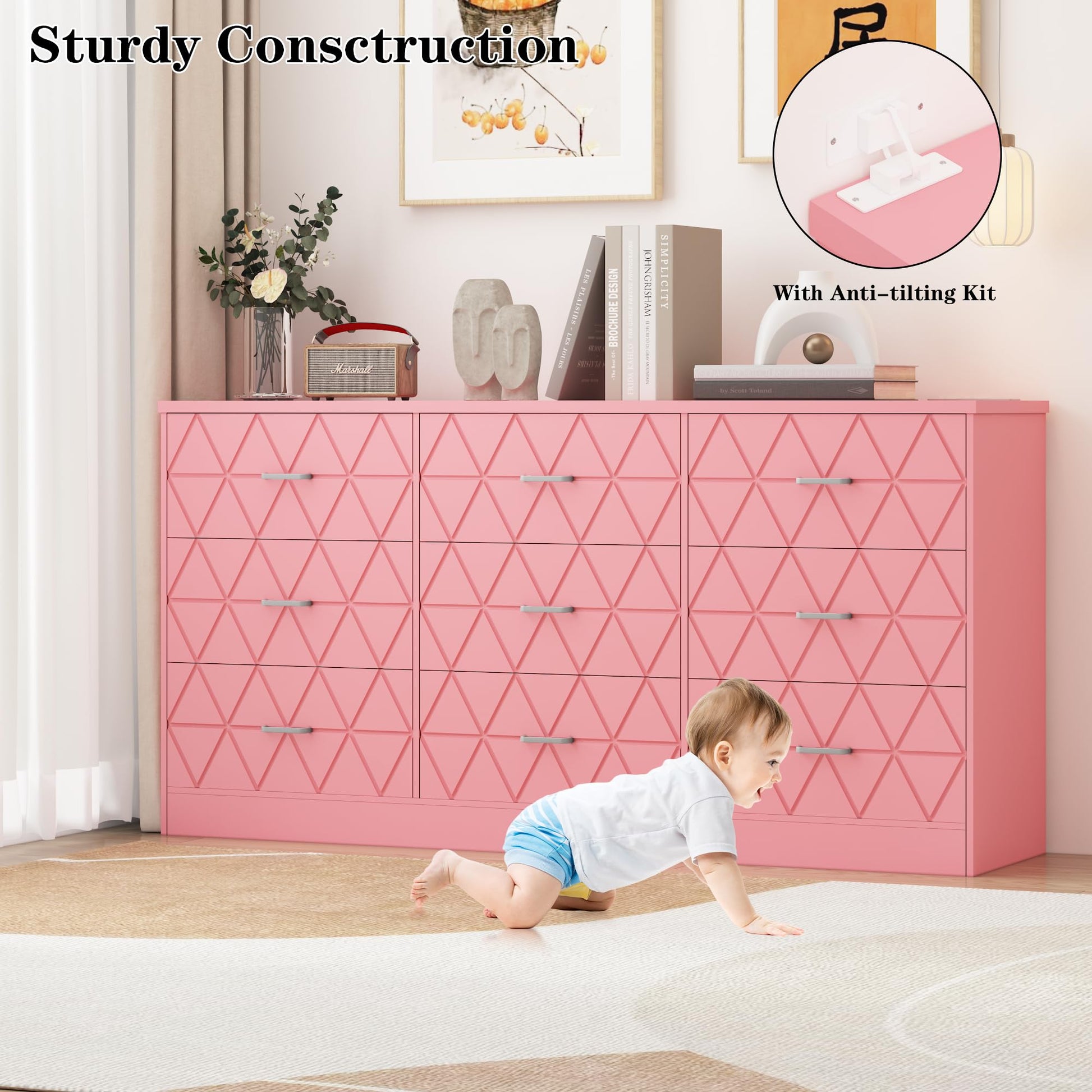 - Durable Metal Slides and Handles: This 9 drawers dresser is crafted from scratch-resistant, moisture-resistant MDF boards and features sturdy metal handles. A light wipe with a damp cloth will keep the dresser looking fresh. The 9 drawers glide smoothly on ball-bearing slides, allowing you to effortlessly push and pull them to keep your items organized.