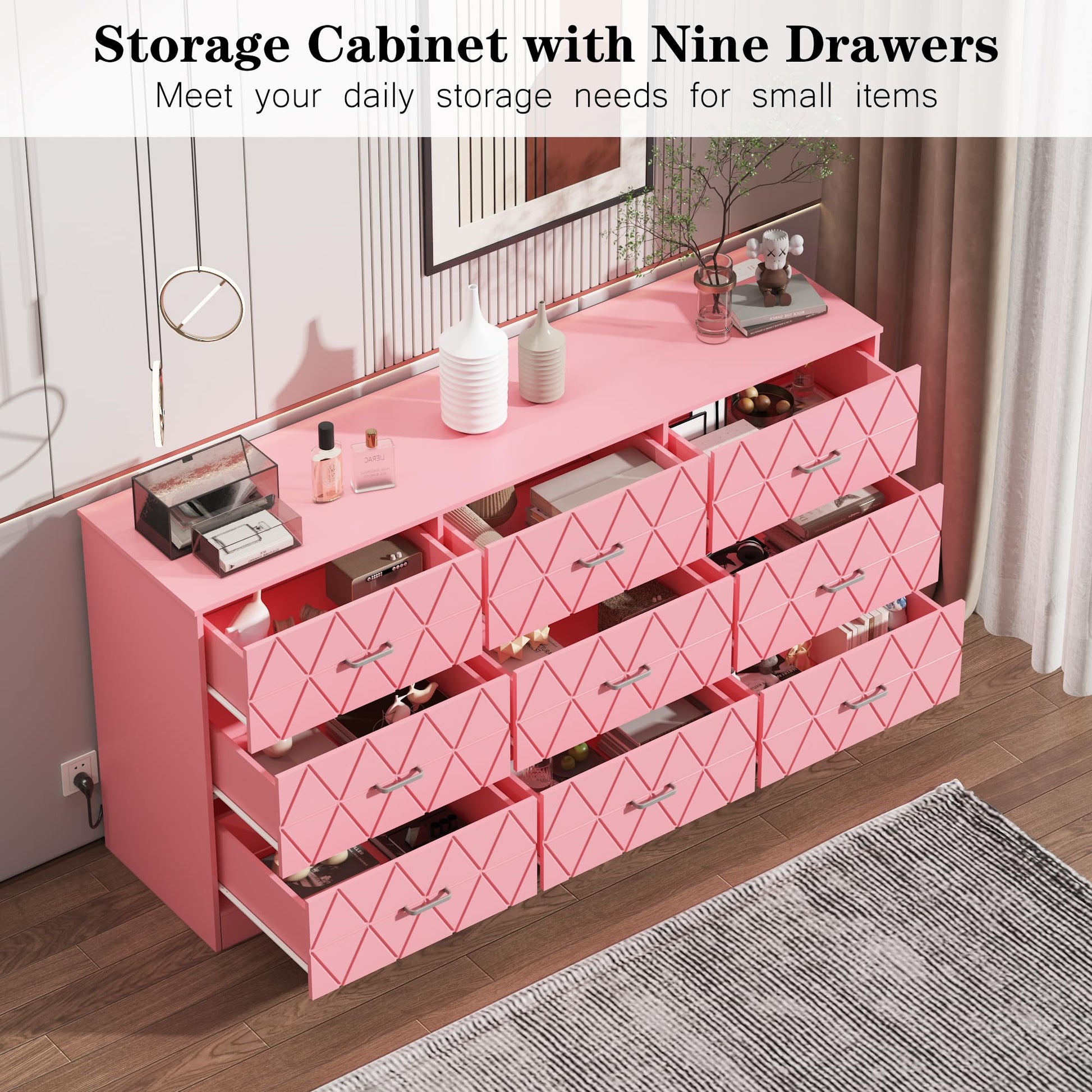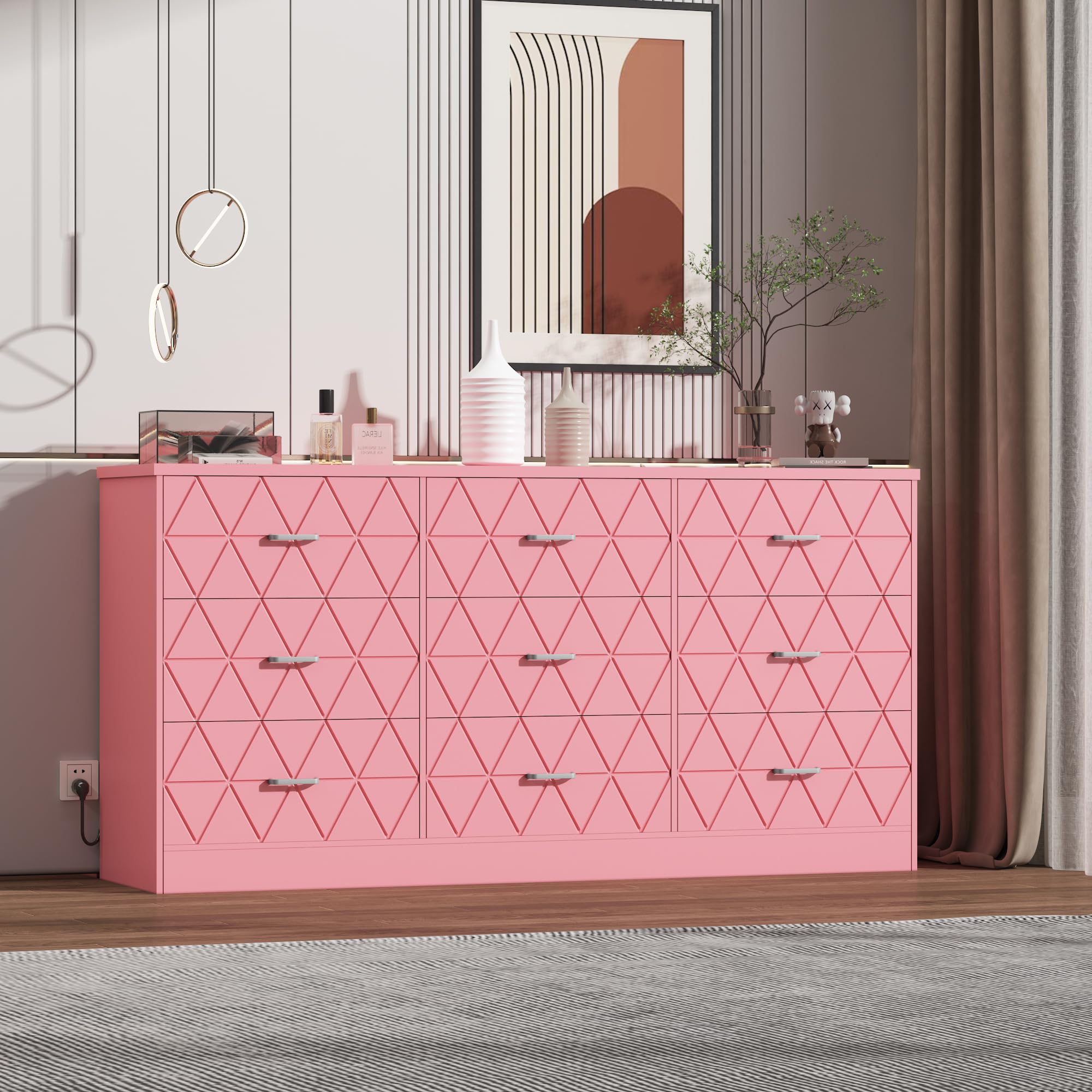 Garvee Modern Pink Bedroom Dresser with 9 Drawers, 63" Wide Dresser Chest of Drawers with Power Outlets, Long Dresser Tv Stand with Large Capacity Storage, Sturdy Storage Cabinet for Bedroom, Living Room
