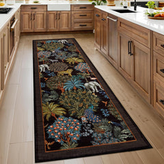 This jungle themed rug goes perfectly with my living room jungle theme rug I have. The colors are similar but the animals go hand in hand. This color rug and the black version of this runner rug id say are the two best colors to get, because the animals pop more and are more noticeable and add a touch of razzle to my hallway. The quality of this rug is that of great. The rug is soft and the pile is medium width. I wish this rug came in longer sizes as a runner, but two of these would work just as good. I’m very pleased with this rug and happy to add it to my African jungle themed home.