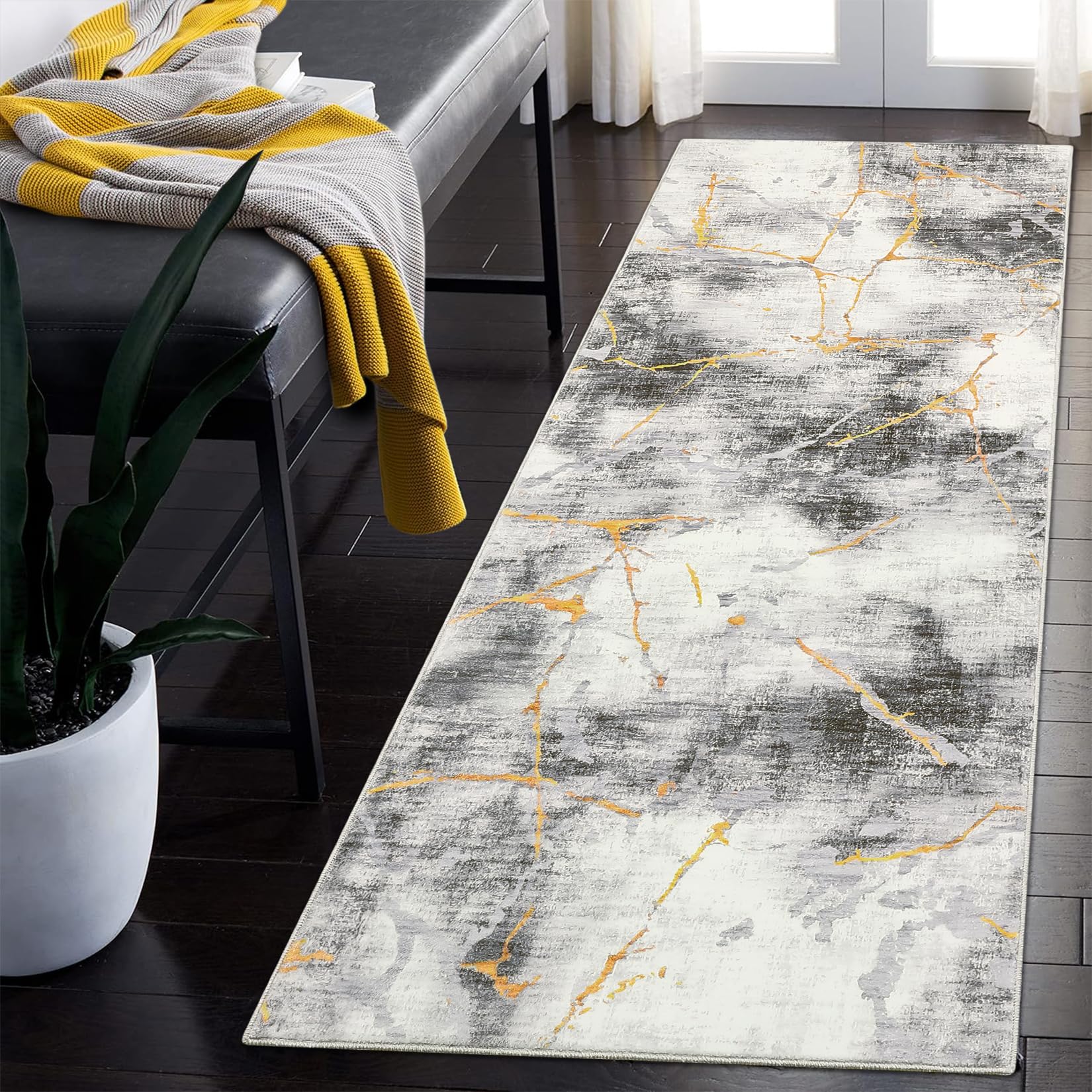 Garvee Modern Runner Rug 2x6 Washable Non Slip Carpet Runner Foldable Low Pile Marble Abstract Design Rug Ultra Soft Contemporary Rug Runner for High Traffic Areas in Entryway, Kitchen, Grey
