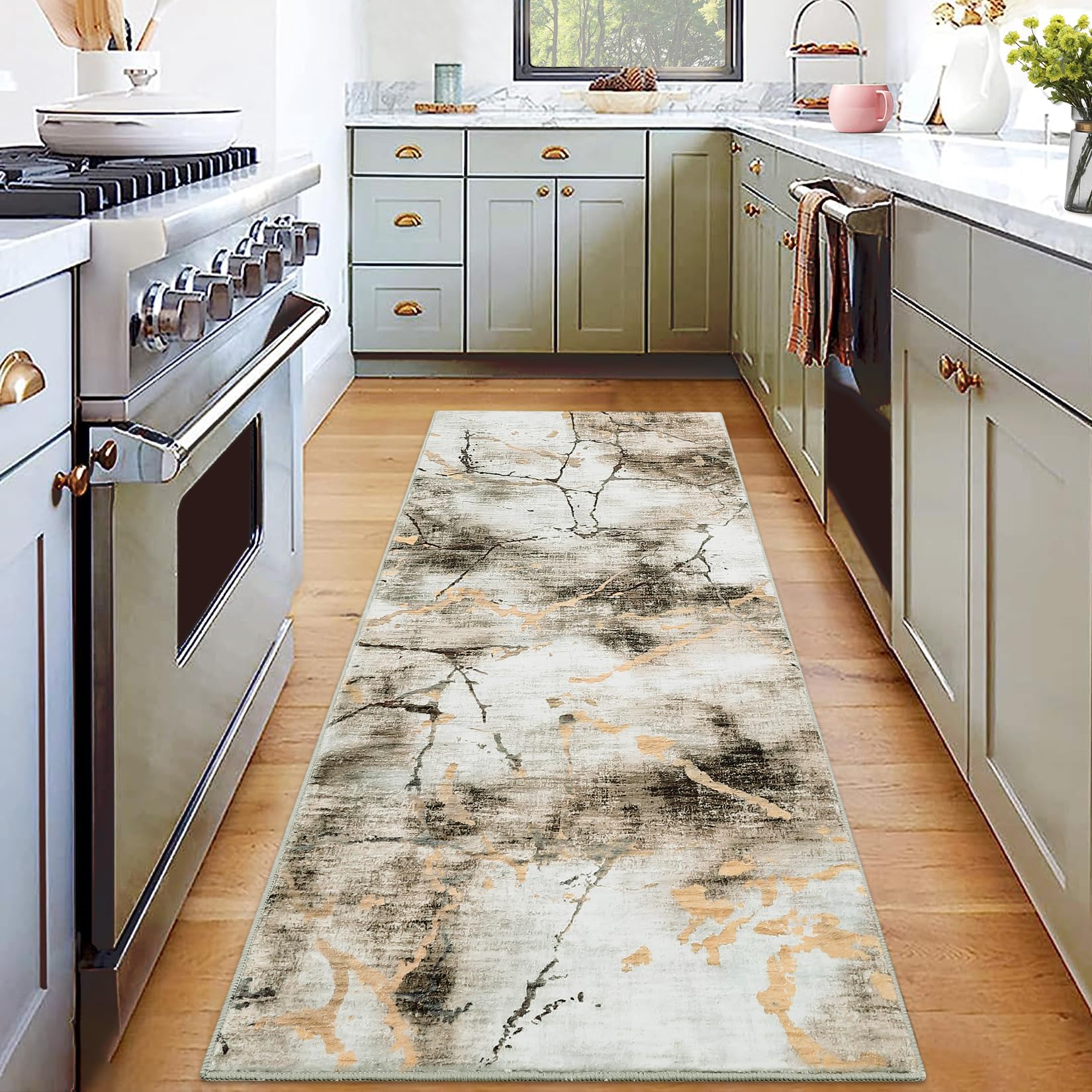 Garvee Modern Runner Rug 2x6 Washable Non Slip Carpet Runner Foldable Low Pile Marble Abstract Design Rug Ultra Soft Contemporary Rug Runner for High Traffic Areas in Entryway, Kitchen, Brown