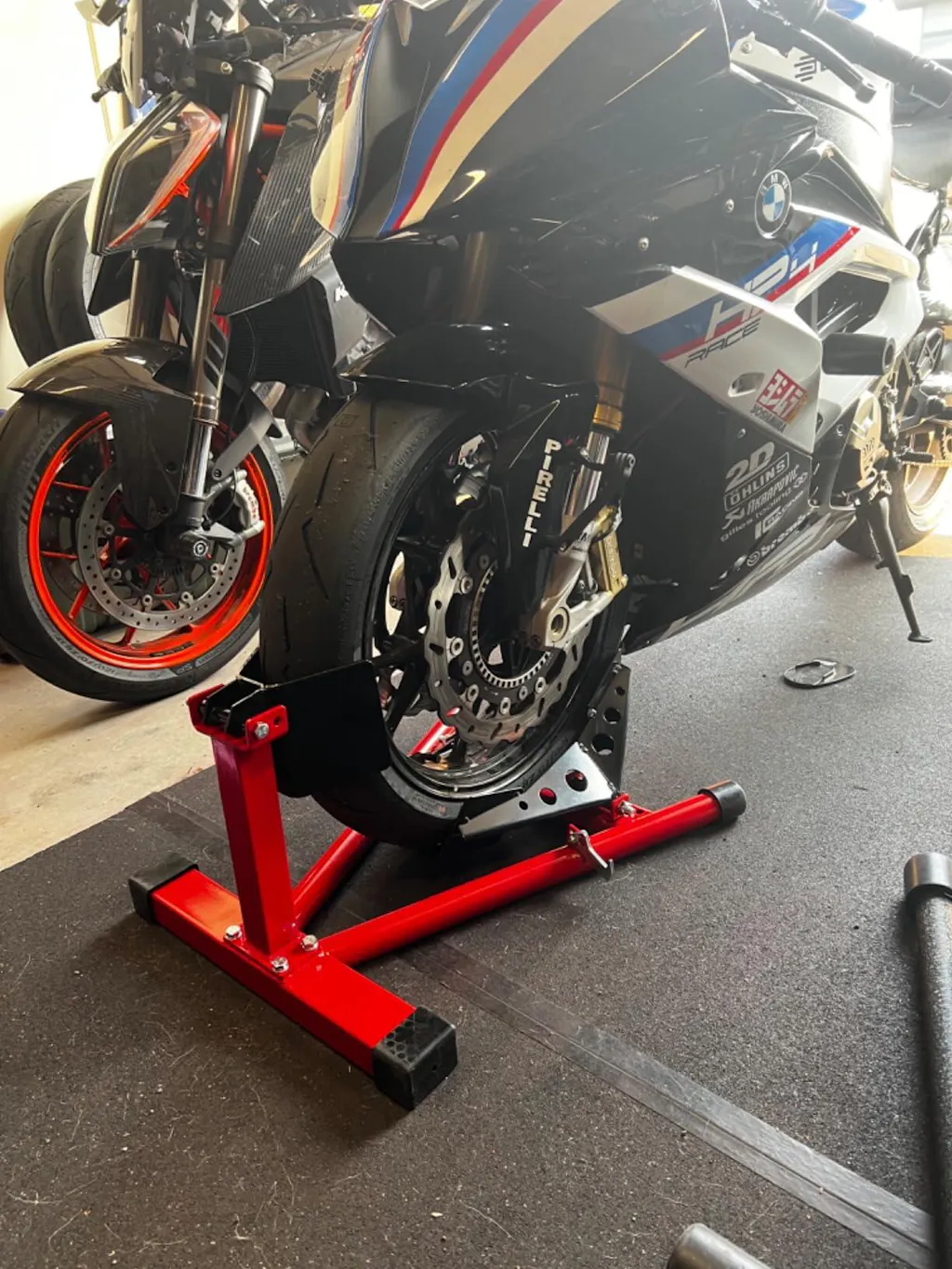 Perfect for garage storage, trailer transport, and shop use. The ideal motorcycle wheel stabilizer solution.