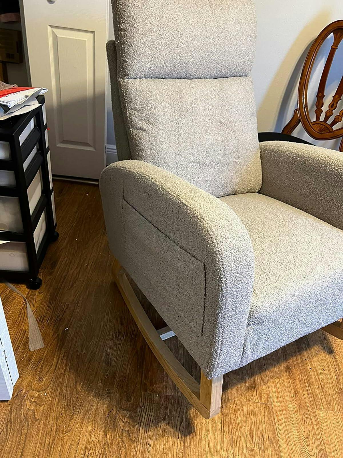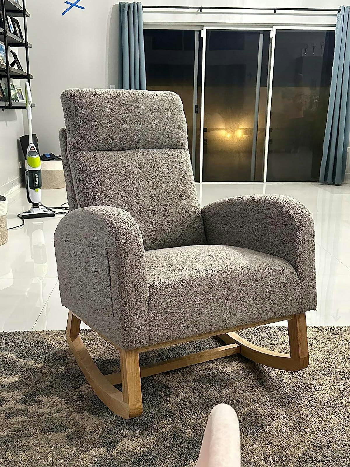 The teddy fleece soft cover fabric of the chair is extremely soft and skin-friendly. The high-back design and the chair body with a strong sense of wrapping provide perfect support, allowing me to relax my waist, back and arms after a day's work, greatly reducing the feeling of fatigue. The gentle shaking function is very smooth and quiet, without any annoying creaking sound. The wooden legs are very sturdy, providing a strong sense of security.