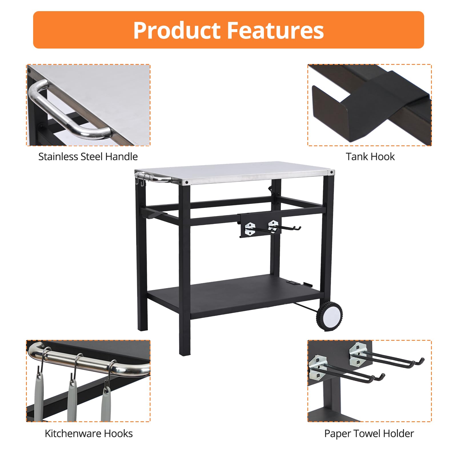 Garvee Outdoor Grill Cart with Wheels & Hooks for Pizza Oven – Portable Stainless Steel Utility Table, Prep Station, Silver