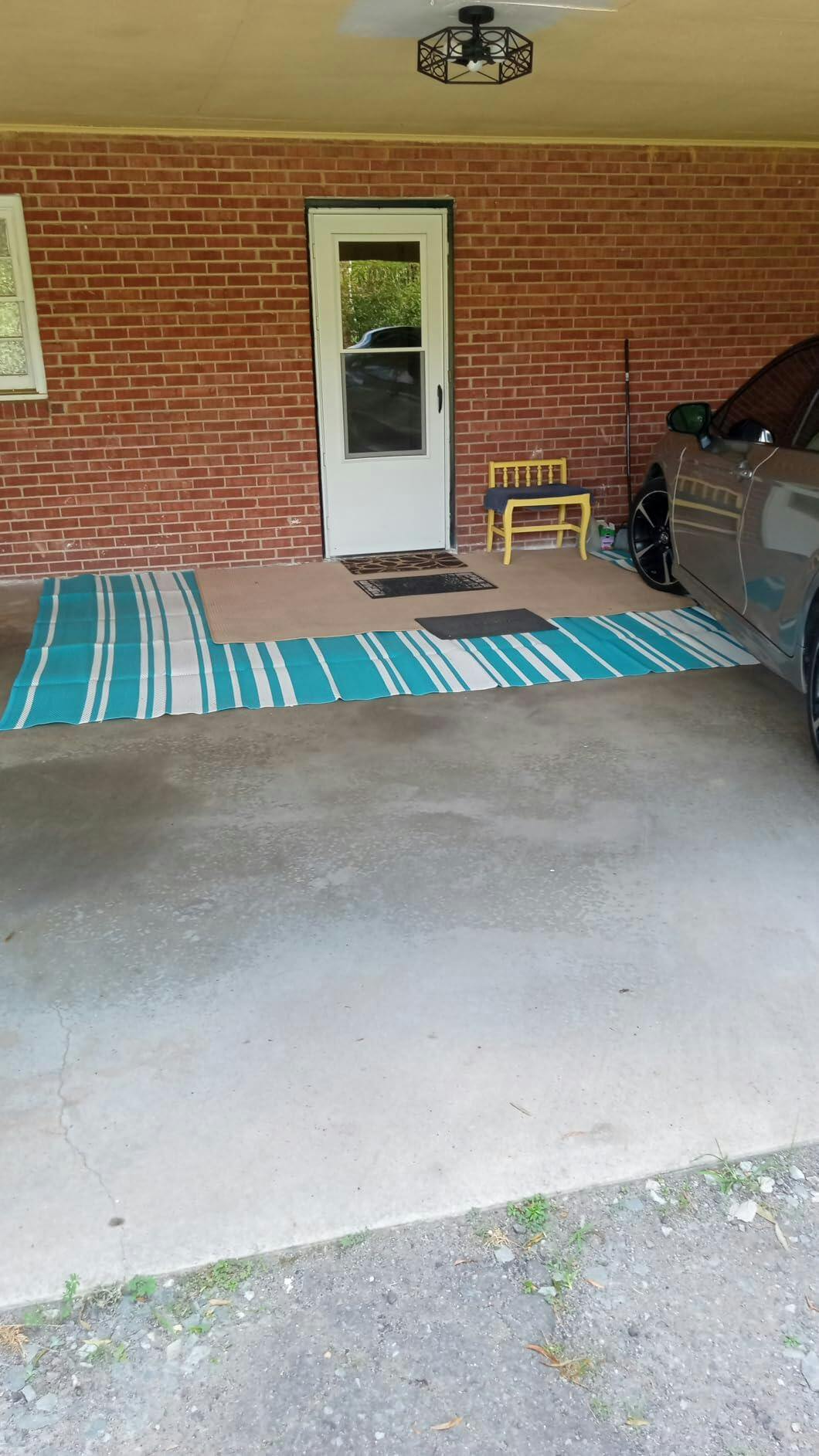 I love this nice large outdoor rug for my carport. It brings a little bit of color to our space, which doesn't matter to a lot of people but my husband and I like it a lot. It's made of the wicker basket type feeling material so it's not for indoors unless you like that sort of thing in your house. It's large enough to cover a big portion of my carport and make it easier to walk on the concrete with my bad back. It's very lightweight and all you need to do to clean it is shake it out or sweep it off. We love it!