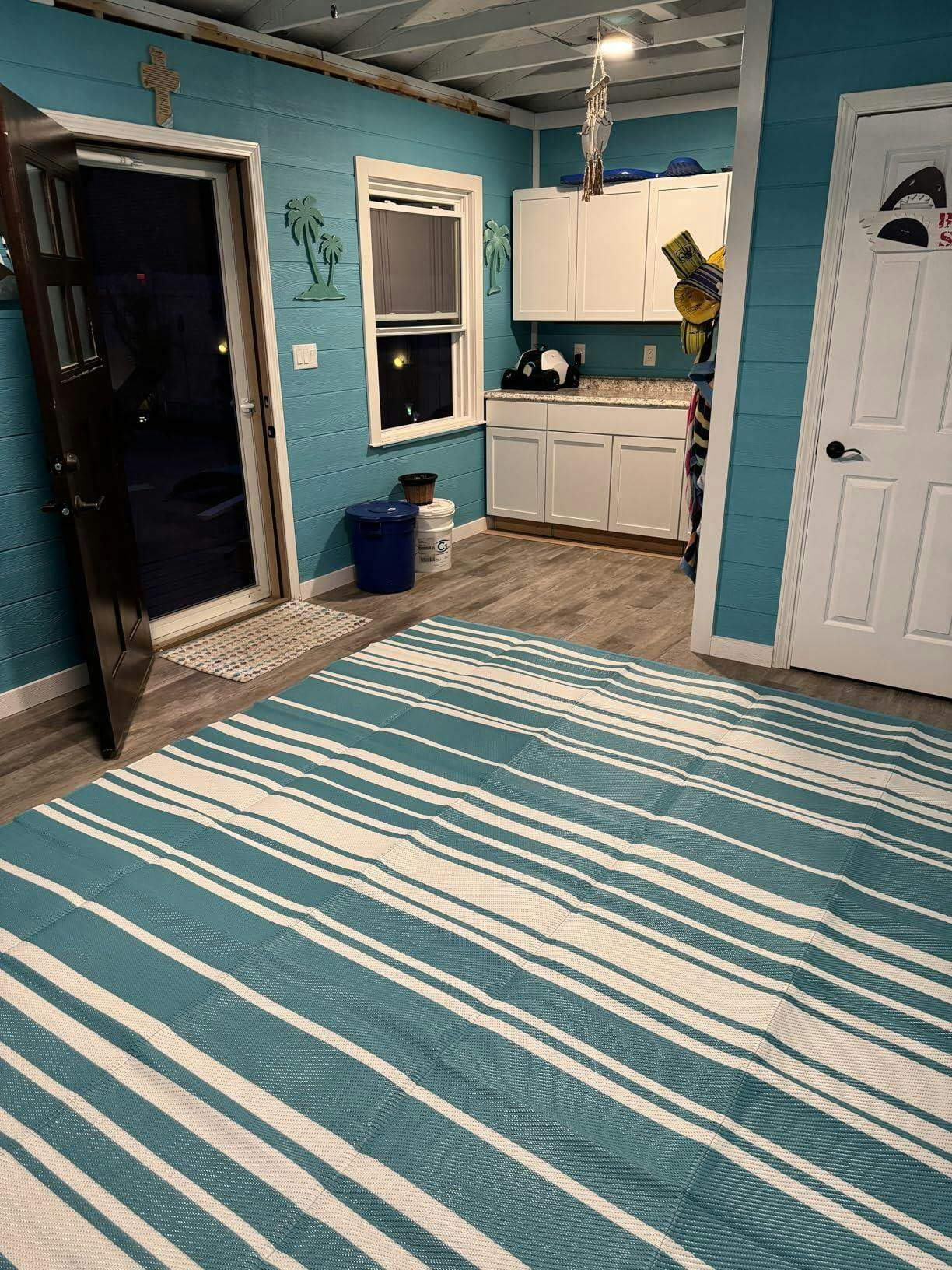 This outdoor rug is perfect! It looks great - the gray and white are really “in” right now. It also works great - it has rained several times during our camping trip and this is keeping the mud to a minimum. It also just spruces up the campsite to make it look nicer and more put together. It’s large enough to cover the whole area in front of the door and basically the whole area under the awning. This makes for a great place for the kids to play too. It’s lightweight and sweeps off easily. The only thing that would make this better is if it came with a carrying/storage case.