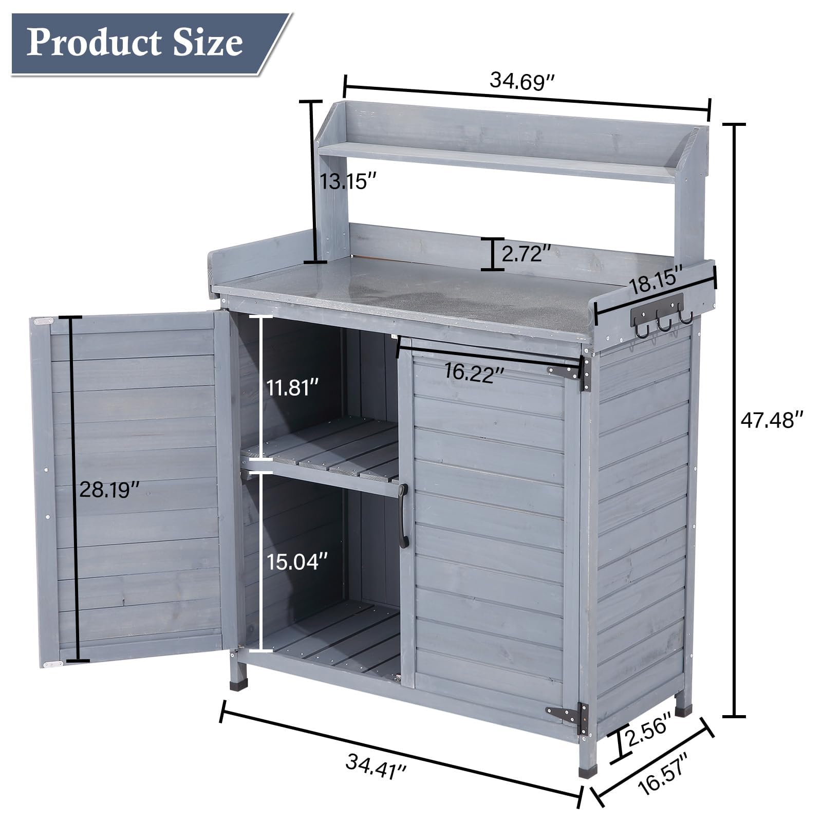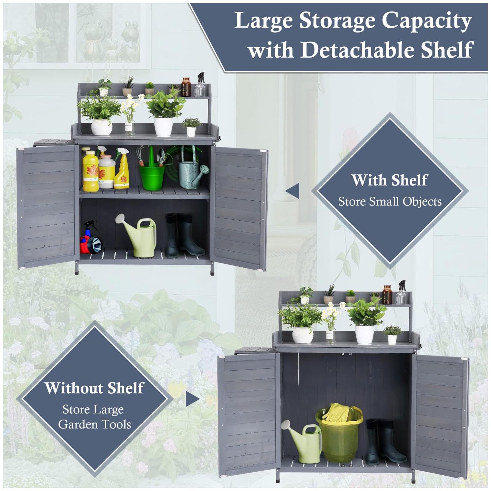 With a roomy tabletop, removable shelf, and enclosed cabinet, you'll have plenty of space to store all your gardening essentials. The big handle makes accessing the cabinet a breeze, keeping your tools organized and within reach.