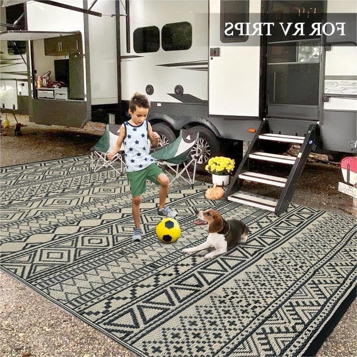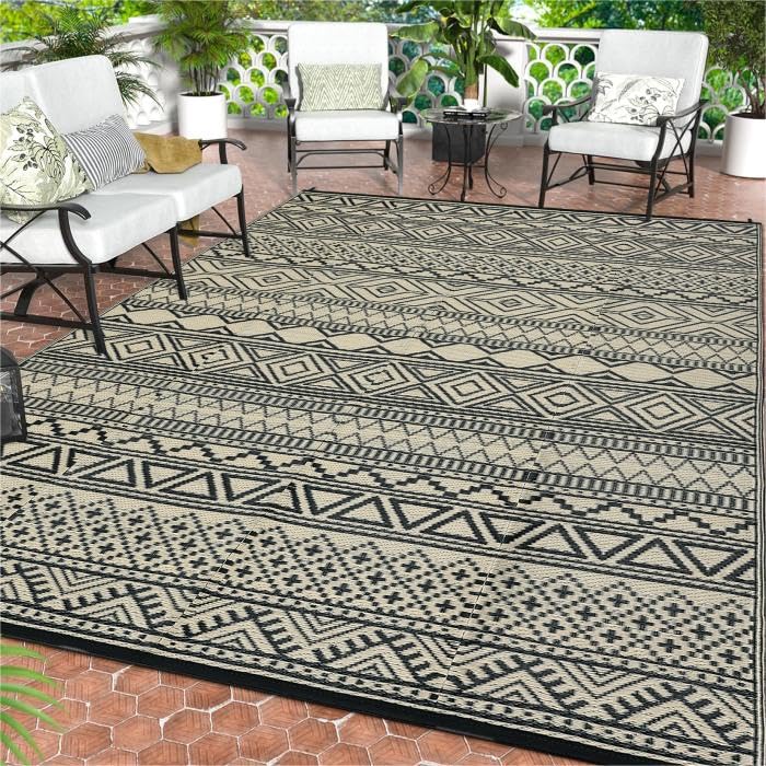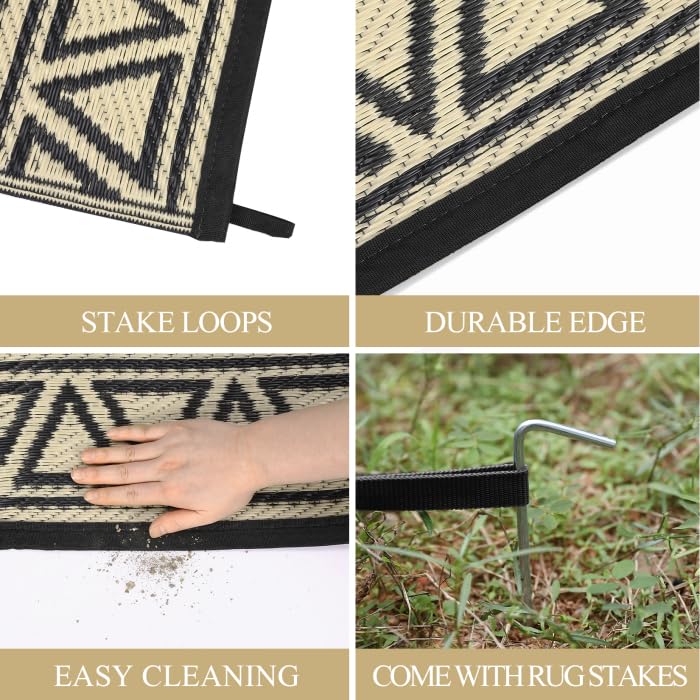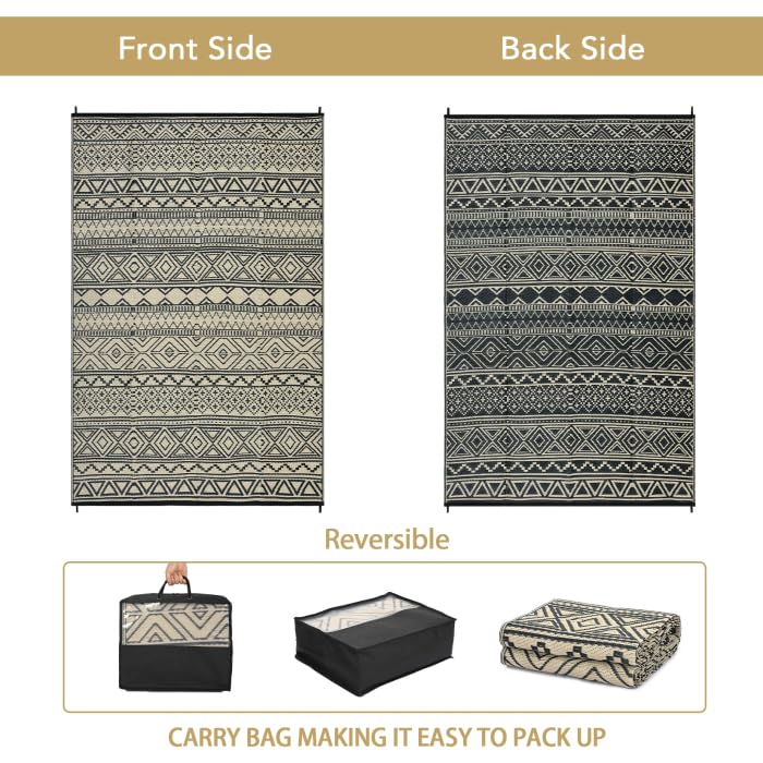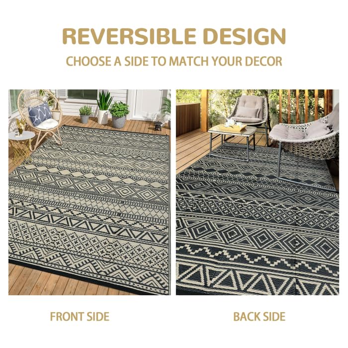 Garvee Outdoor Black & Coffee 6x9 Reversible Rug. Waterproof Plastic Straw Mat, Modern Bohemian Style, Eco-friendly, Easy to Clean, Portable, Suitable for Patio, Porch, Deck, Backyard, Picnic