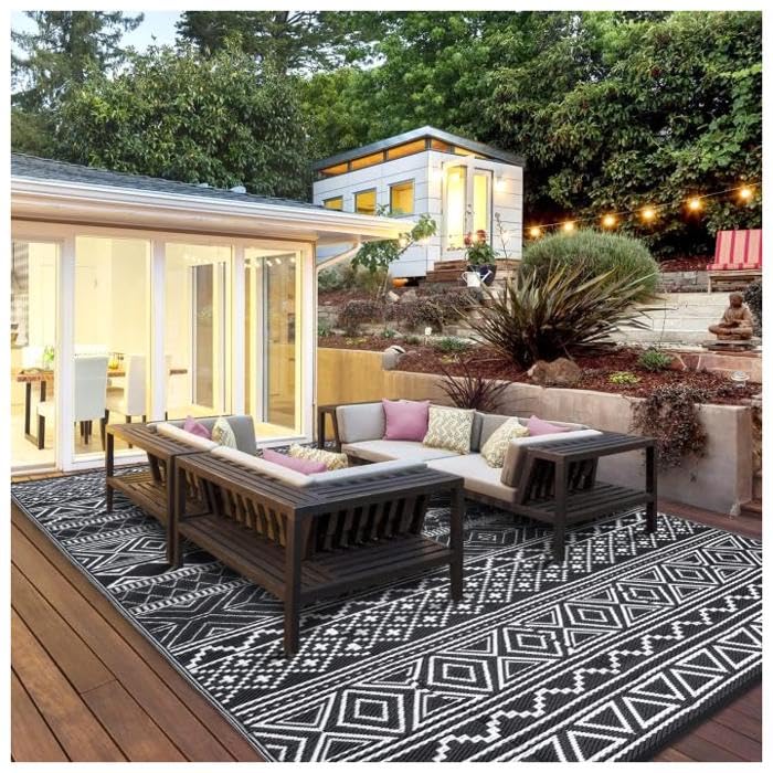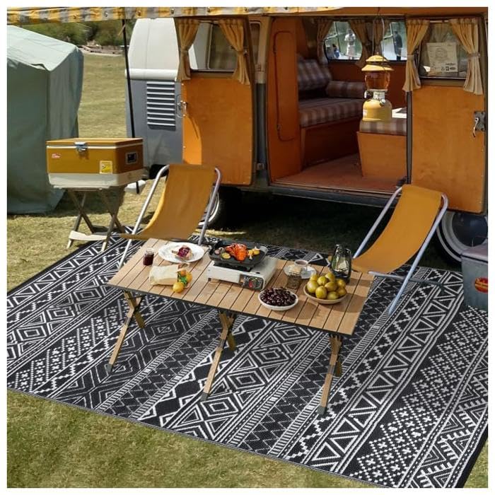 Garvee Outdoor Black & White 9x18 Reversible Rug, Waterproof Mat, Modern Bohemian Style, PP Plastic, Easy to Clean, Portable, for Camping, Patio, Deck