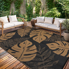 This outdoor rug is the type that you can spray off with a hose. It is woven polypropylene which is a type of soft plastic. I like that it is so lightweight and comes with stakes and a carrying bag. I also really like the colors of the Black and Beige Leaf design that I chose. The colors really pop and look nice in person. I plan on using this with my 10x10 pop-up canopy that I bought a two-room tent to go around that screens in the canopy area. This is the perfect size since I will have an 8ft by 2ft folding table that I can place on the 2ft area the rug does not cover that I will cook on. The fact that it comes with stakes and a bag makes it perfect for camping along with the type of material it's made out of. I think it is priced reasonably and hopefully it will hold up over time and stay looking colorful. Id say it's a winner or I am for getting it!