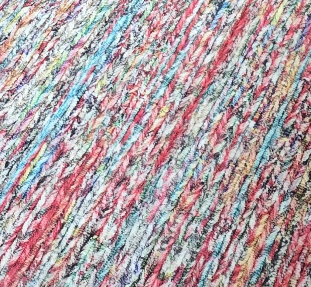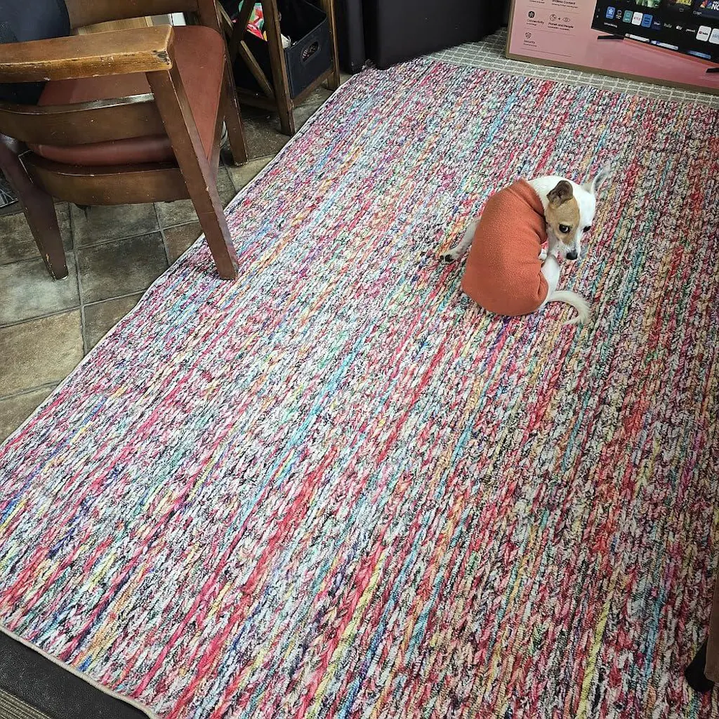 This is non-slip which is great for me and a playful dog who scoots rugs all over the house. I love the colors even though they were brighter than I imagined. The pattern is printed on it yet it looks like a real braid, even up close. Nice optical illusion. I use a heavier wool throw for winter (insulation) and this is wonderful for spring and summer.