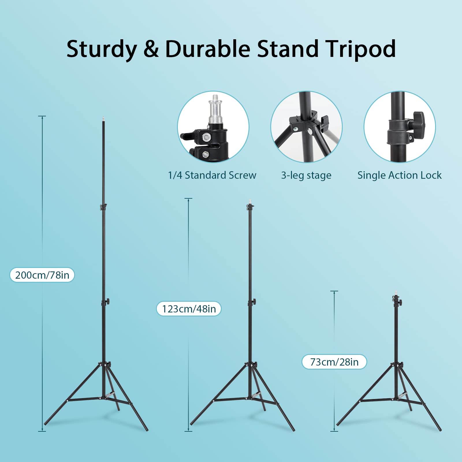 The light stand constructed from aluminum alloy, can be flexibly adjusted between 28" and 78", with stable 3-legs stage and quick single action lock, it only takes a few seconds to lock and release. In addition, soft box comes with 210° rotatable head which can adjust the angle according your needs.