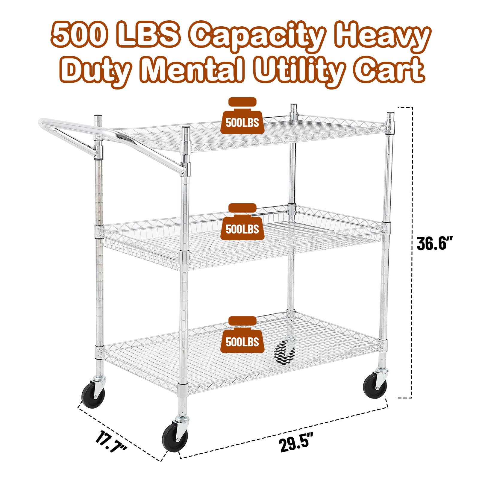 - Heavy-Duty Construction: Built with commercial-grade alloy steel, our utility cart features 3 sturdy tires and wire shelves that can handle up to 500 lbs while moving, ensuring long-lasting durability and stability.