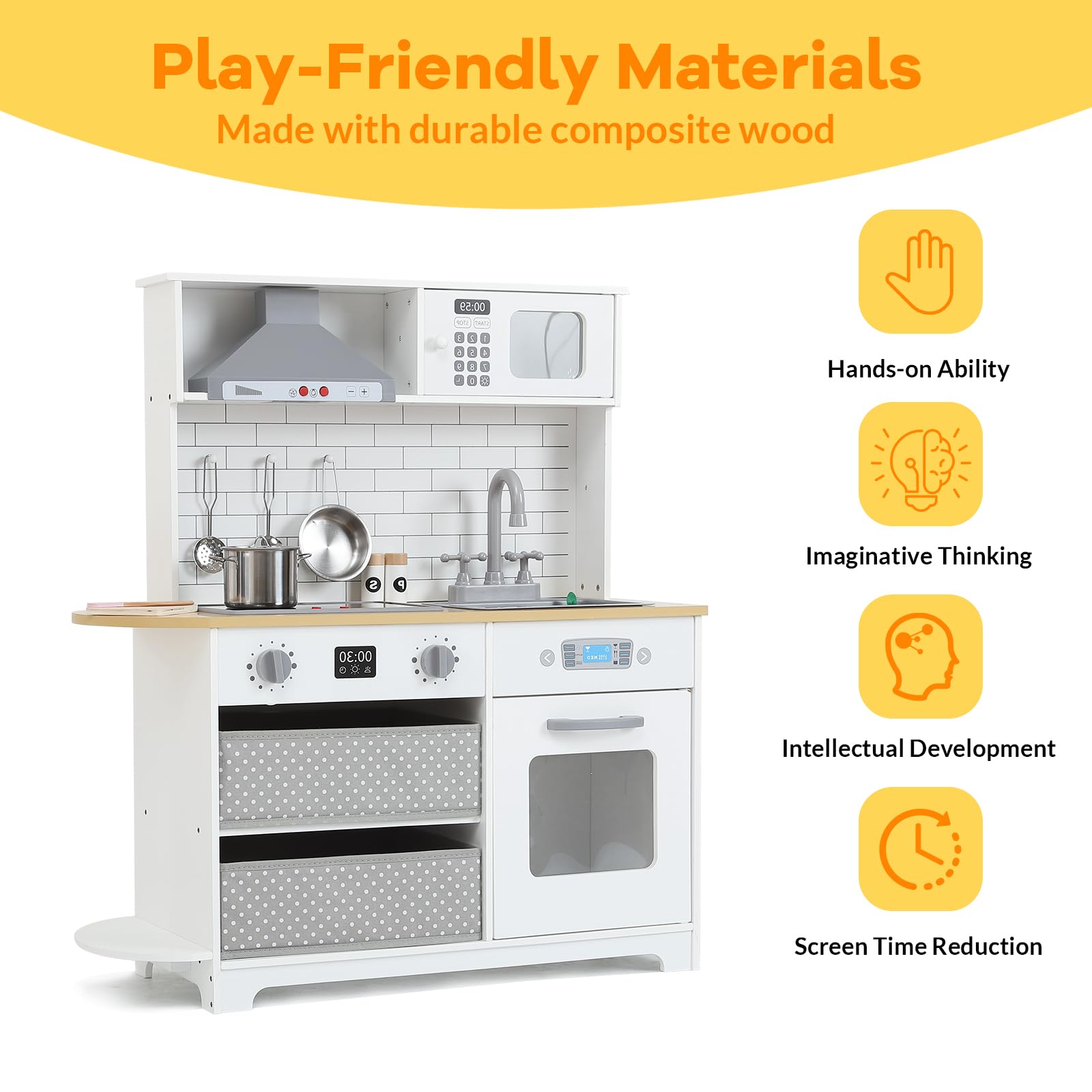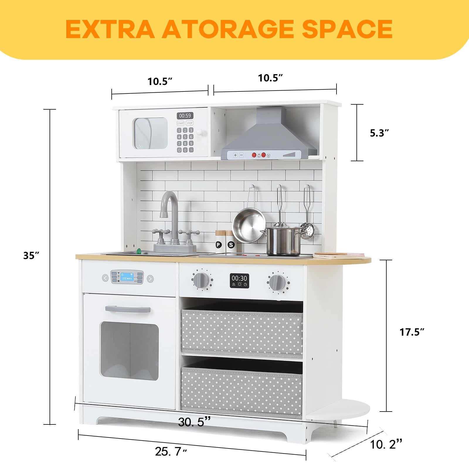 - Organizational Features: Equipped with 2 fabric drawers for easy storage, keeping the kitchen tidy and teaching kids the importance of organization and responsibility during playtime.
