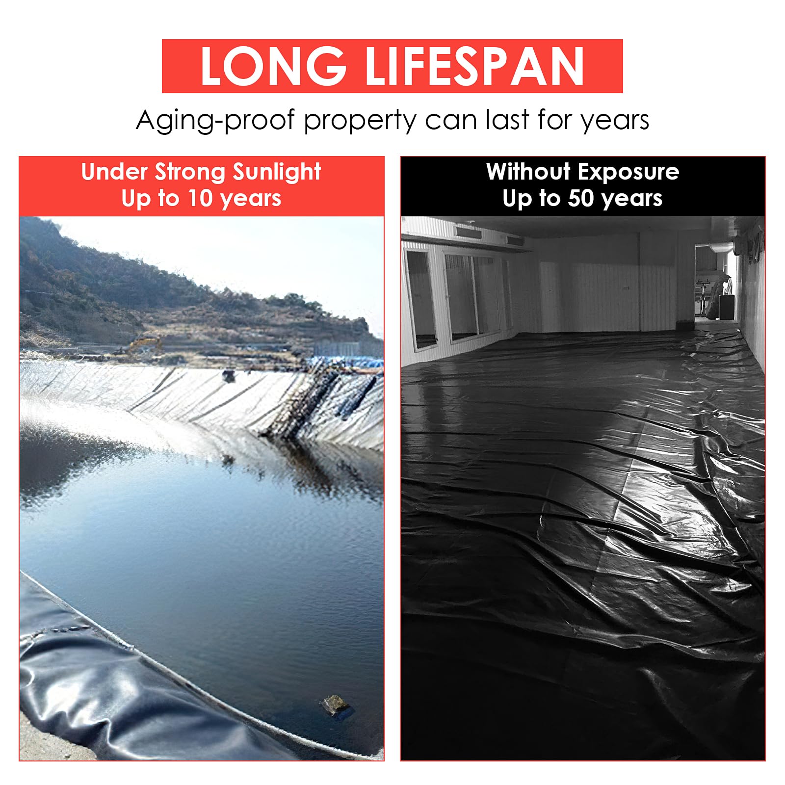 This large pond liner is designed for aging-proof can last for years. It can live up to 10 years of exposure to direct intense sun and more than 50 years without exposure