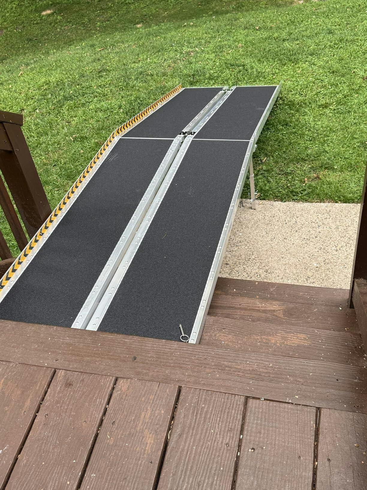 From grandma's wheelchair to our baby stroller, this ramp works for everything! Folds up small enough to keep in my car for unexpected curb access. Worth every penny for the independence it provides!—we use it for our RV steps, front porch, and even took it to a friend's house with stairs. The aluminum stays clean-looking and hasn't rusted after months of outdoor use. Best purchase we've made for accessibility!