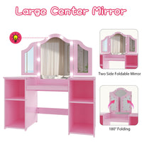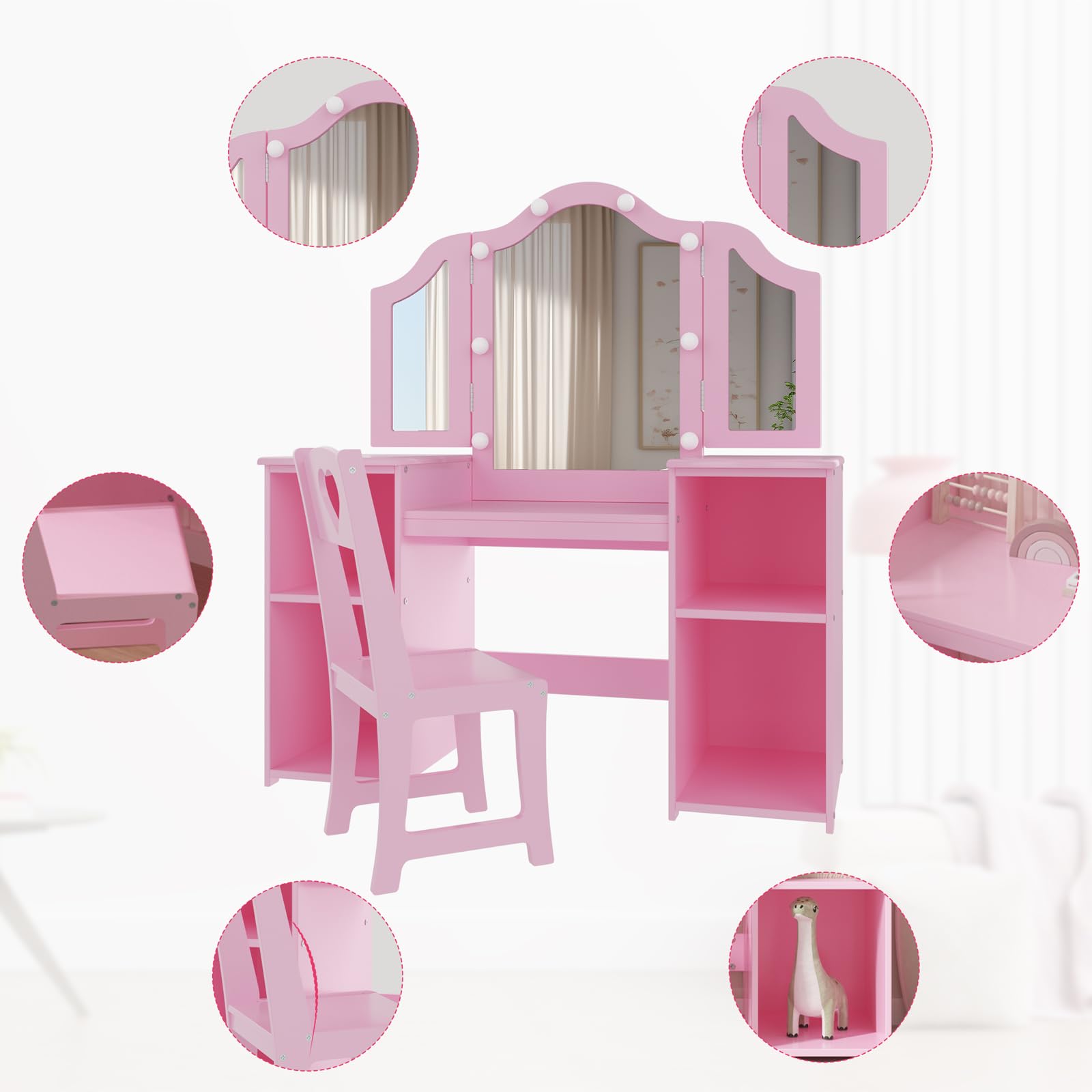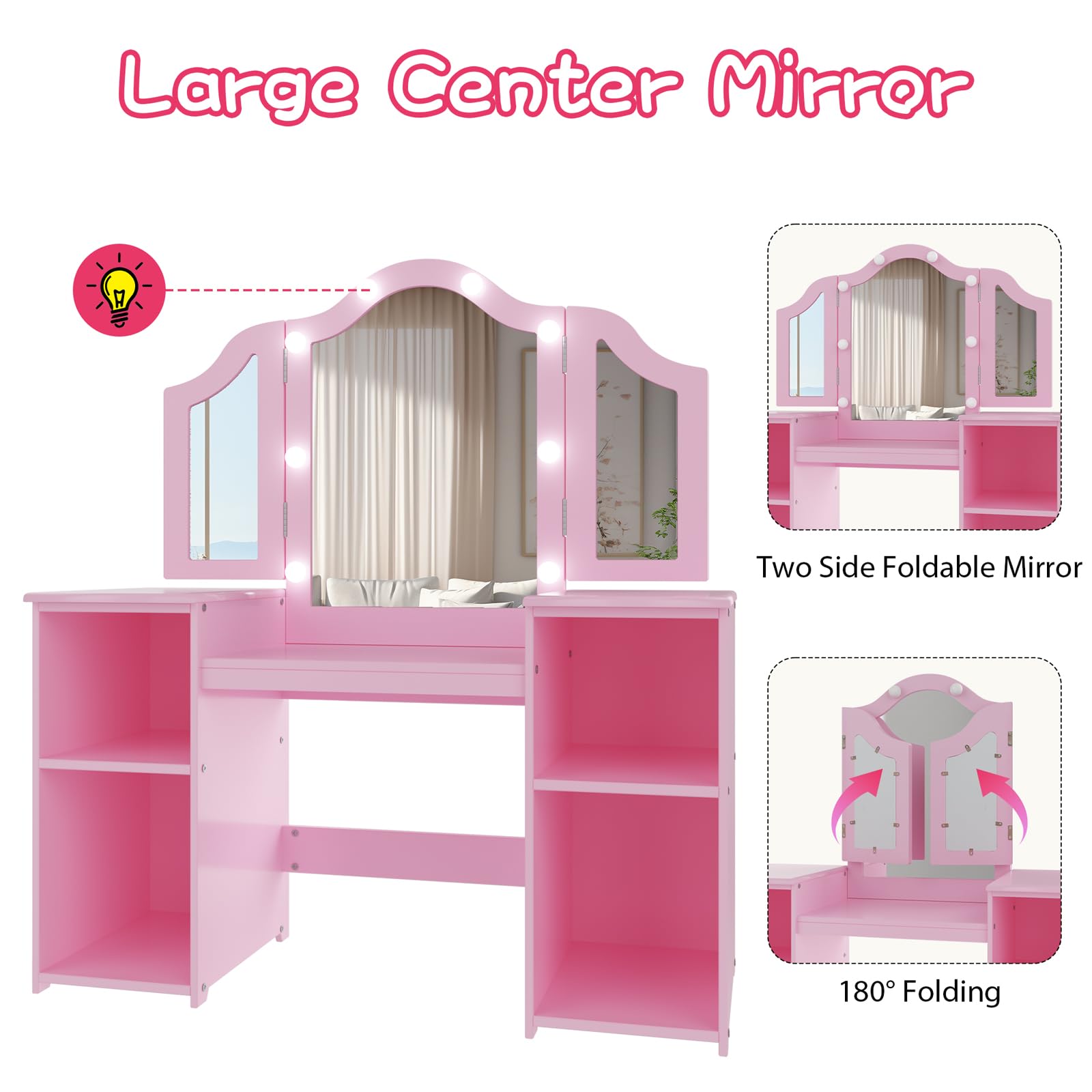 Garvee Kids Vanity Table, Girls Vanity with Touch Light Detachable Tri-Folding Mirror, Open Storage Shelves, Wood Makeup Playset with Chair, Princess Vanity Table for Toddlers - Pink