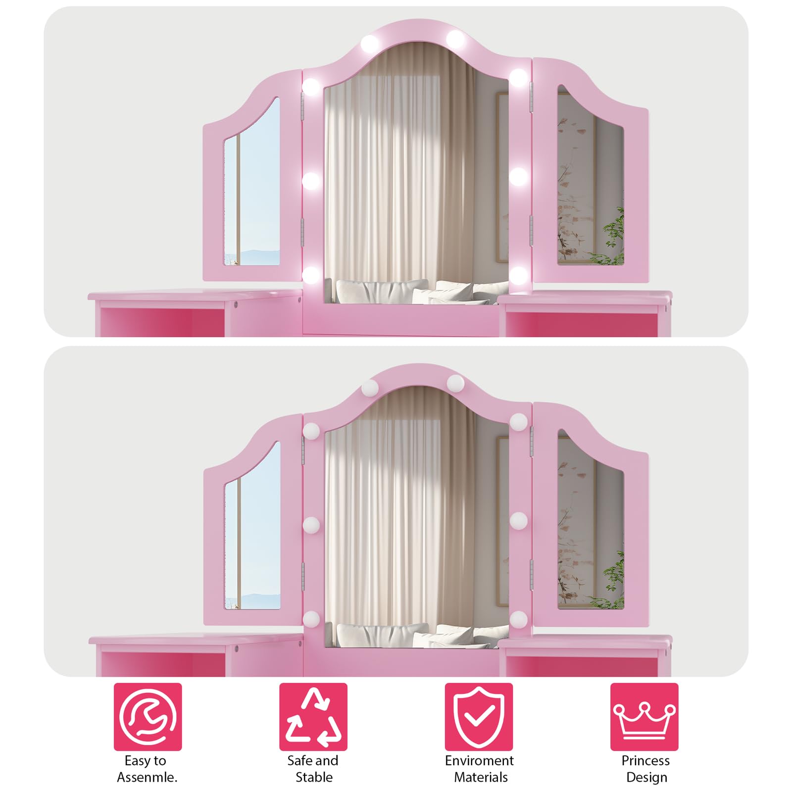 Garvee Princess Vanity Set for Toddlers - Kids Vanity with 3 Mirror & Light, and Stool, Pink