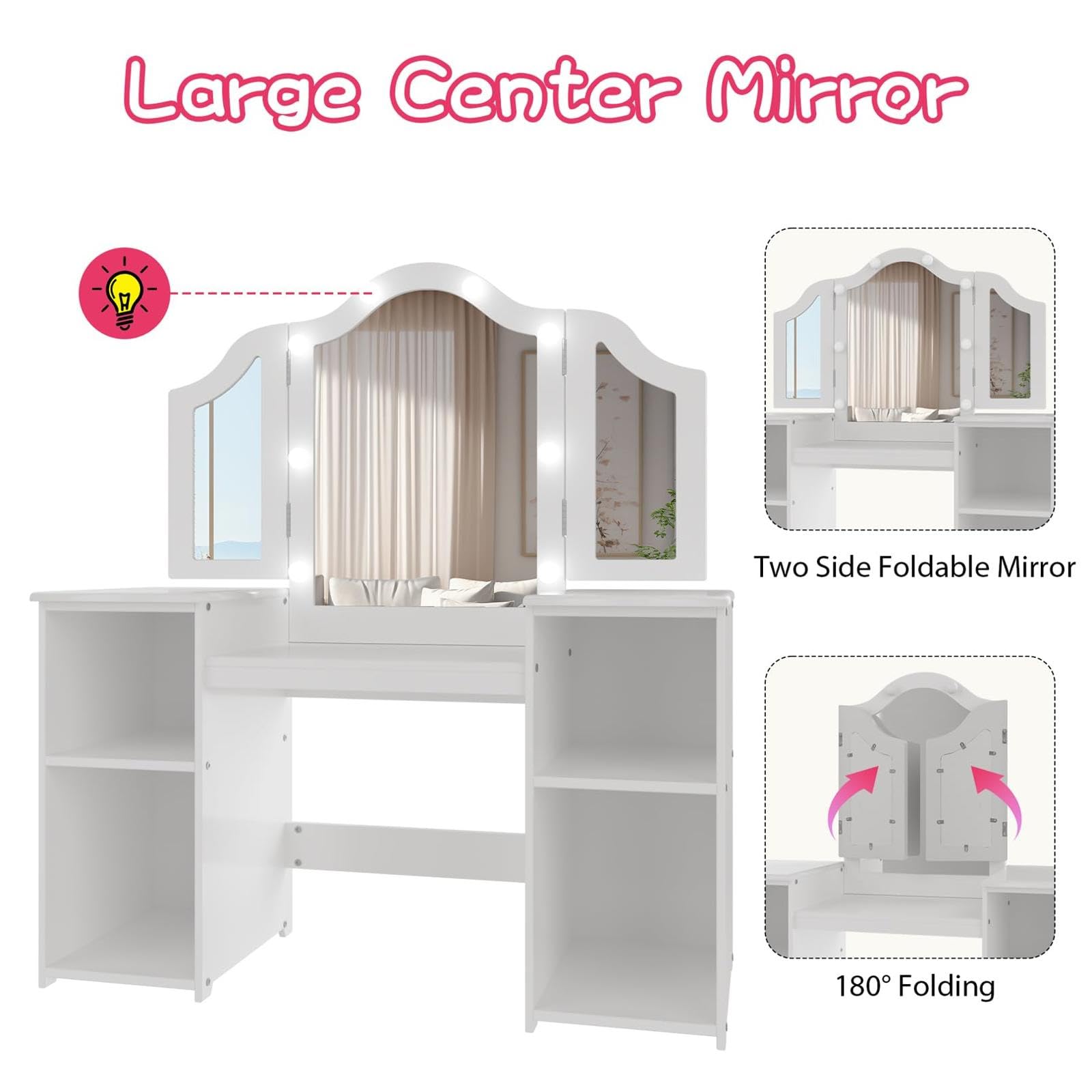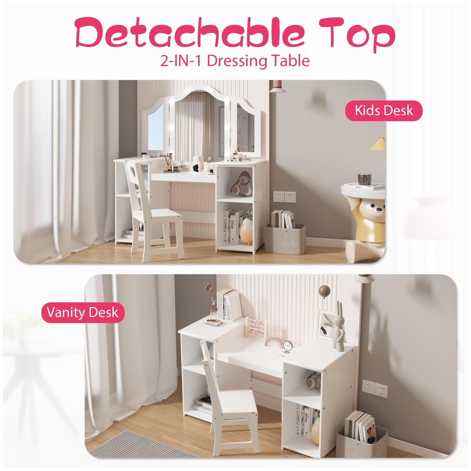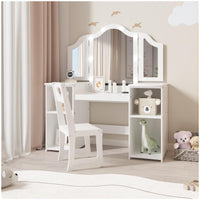 Garvee Kids Vanity Table, Girls 2 in 1 Princess Makeup Desk with Touch Light Detachable Tri-Folding Mirror, Open Storage Shelves, Wood Makeup Playset with Chair, Princess Vanity Table for Little Girls
