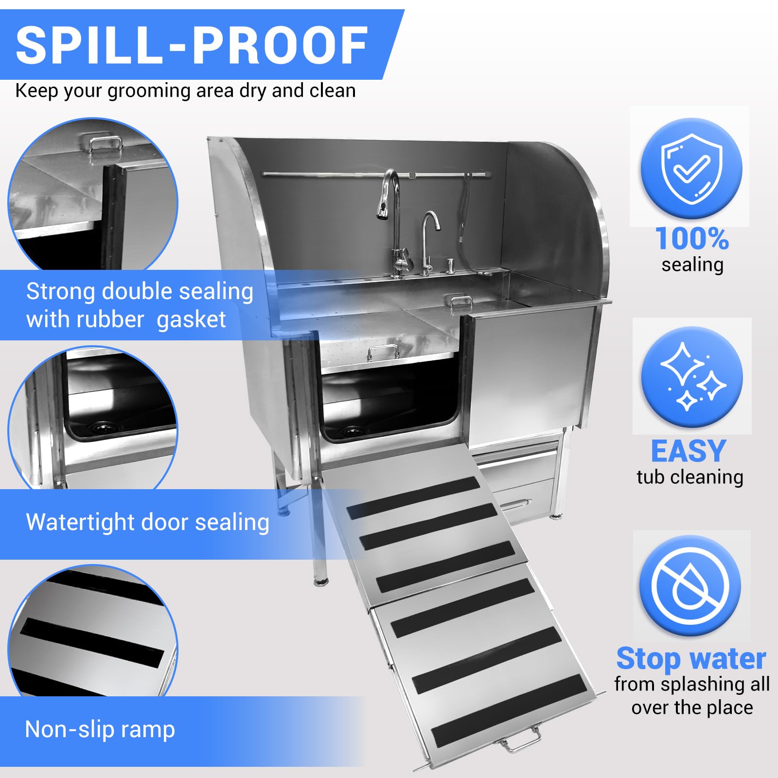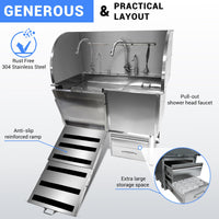 - Telescopic Ramp and Sliding Storage Drawer: The non-slip pet ramp and sliding storage drawer provide easy access and organization for dog bathing supplies and grooming accessories.
