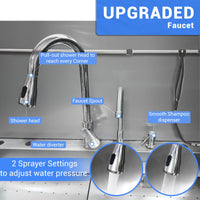 - All-Inclusive Accessories: The grooming station comes with all necessary accessories, including a premium quality faucet with a pull-out dog wash sprayer, soap dispenser, drain kit, hair trap, and grooming restraint rail, providing everything needed for dog bathing and grooming.