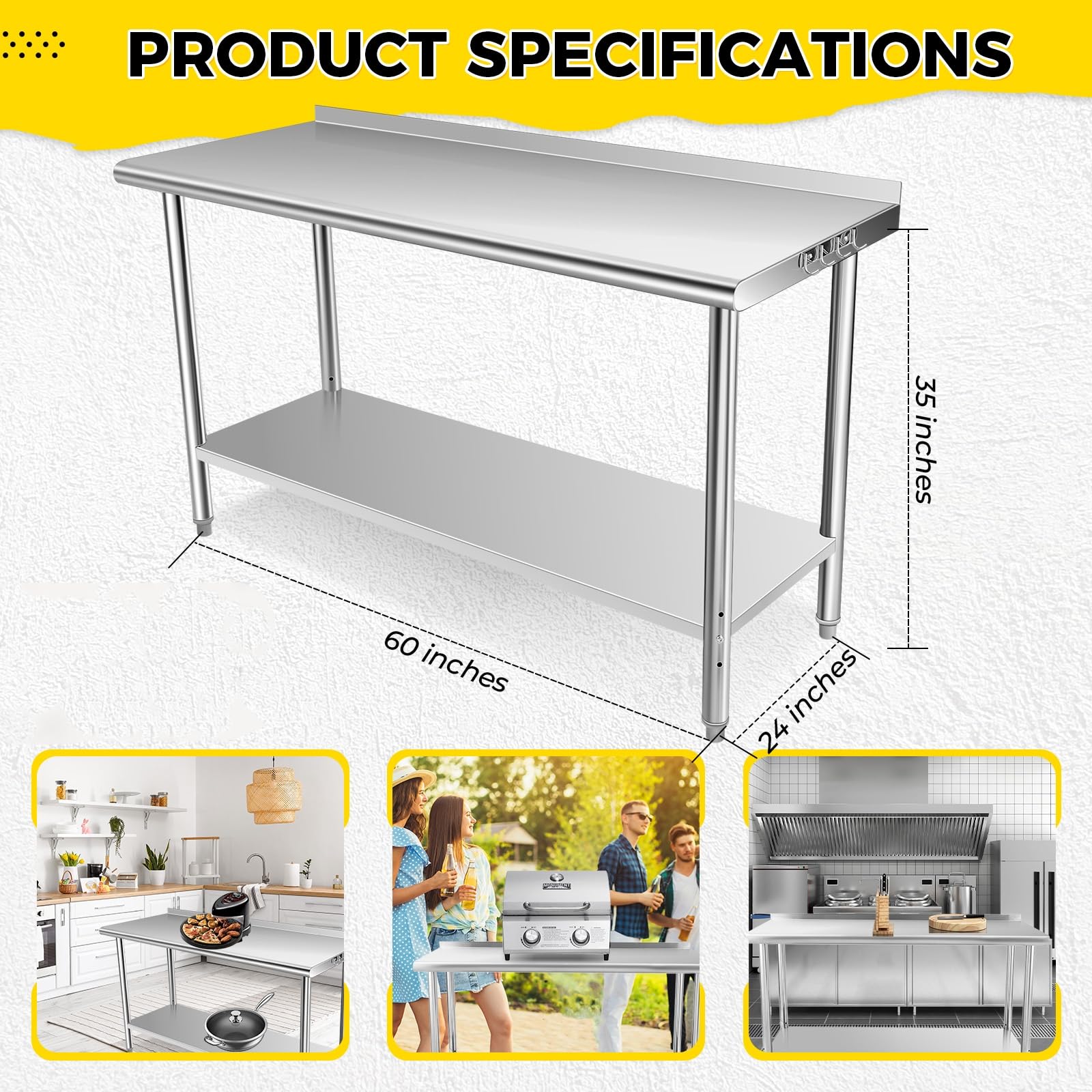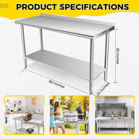 GARVEE 60"L x 24"W x 35"H Stainless Steel Table - NSF Certified Kitchen Prep Table with Backsplash and Adjustable Undershelf for Restaurant, Home, and Hotel Use