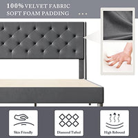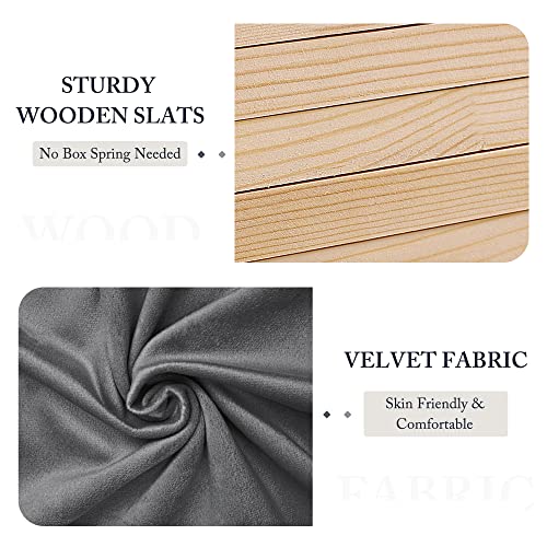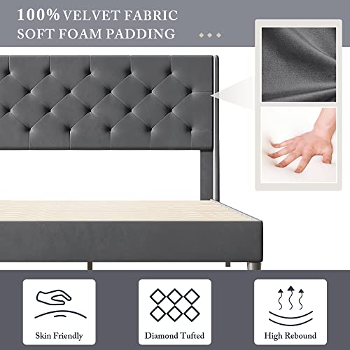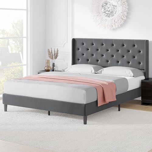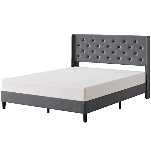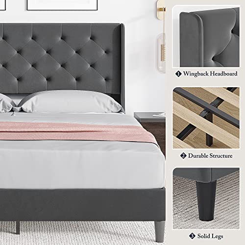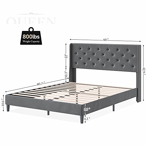 Garvee Queen Button Tufted Platform Bed Frame + Velvet Upholstered + Wingback Headboard + Strong Wooden Slats + Noise-Free + Plastic Foot Plugs + Dark Grey, Queen + Bedroom