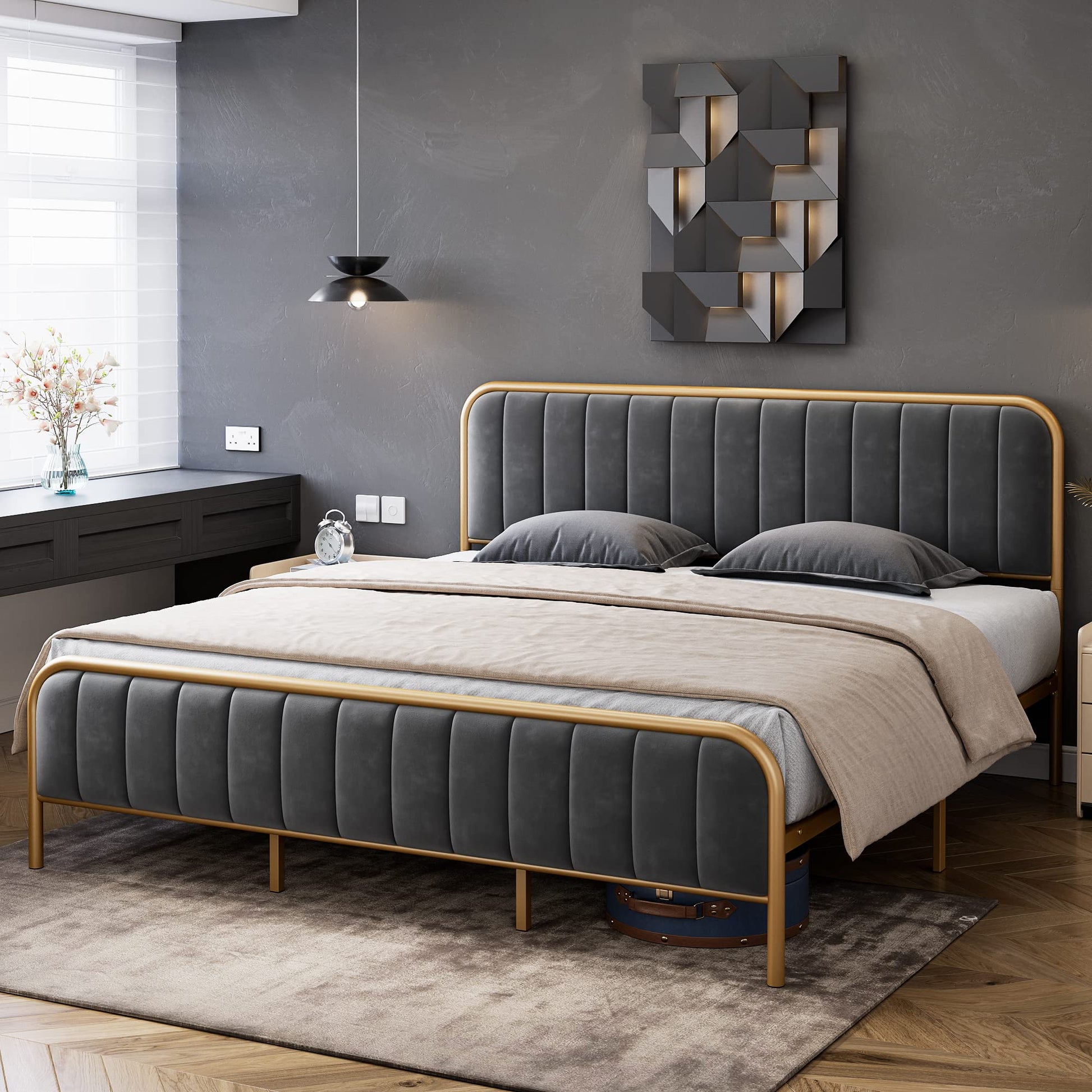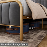 Garvee Queen Gold Platform Bed Frame + Velvet Tufted Upholstered Headboard + 10.2” Under Bed Storage + Durable Metal Mattress Foundation + Wood Slats Support + No Box Spring Needed + Grey
