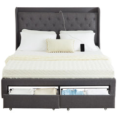 Garvee Queen Size Bed Frame with 2 Storage Drawers & USB Charging Station, Upholstered Platform Bed Frame with Type-C,Wingback Storage Headboard /Sturdy Wooden Slats Support/No Box Spring Needed/Dark Grey
