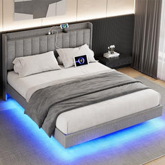 Garvee Queen Size Floating Bed Frame with LED Light,Modern Metal Platform Bed Frame with Charging Station,Upholstered Bed Frame with Headboard,No Box Spring Needed,Beige