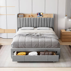 Garvee Queen Size Upholstered Bed Frame with Storage Drawer & Headboard, Charging Station, No Box Spring, Easy Assembly, Beige, Bedroom
