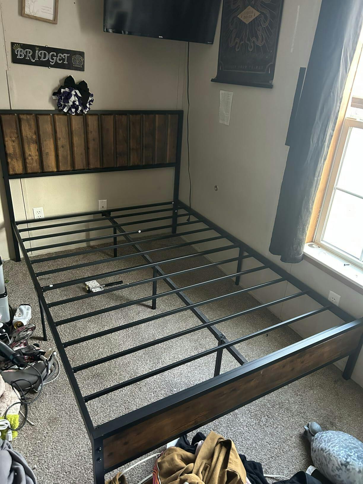 With its robust metal frame, stylish wood grain headboard, and noise-reducing design, this bed frame combines functionality with aesthetics. The easy assembly process ensures you'll be enjoying your new bed in no time.