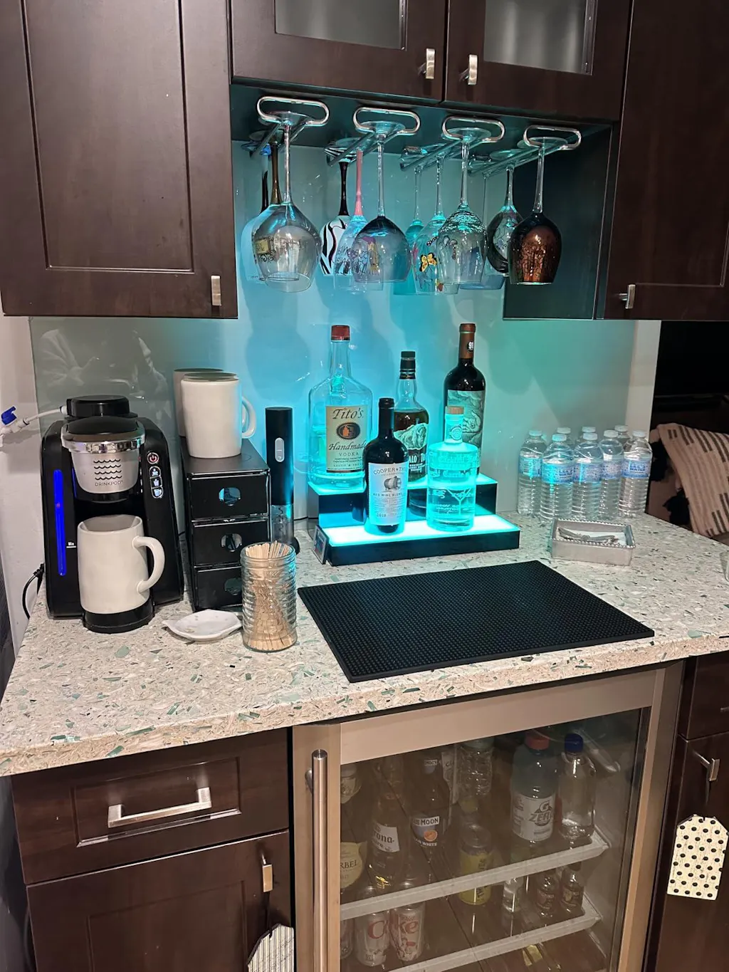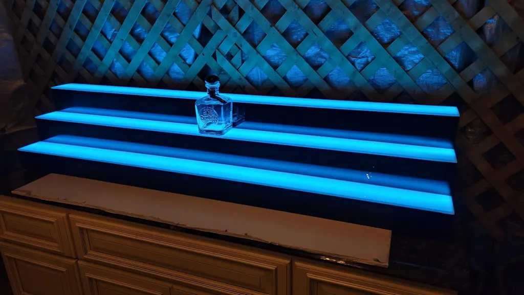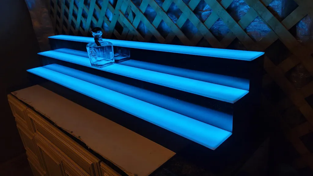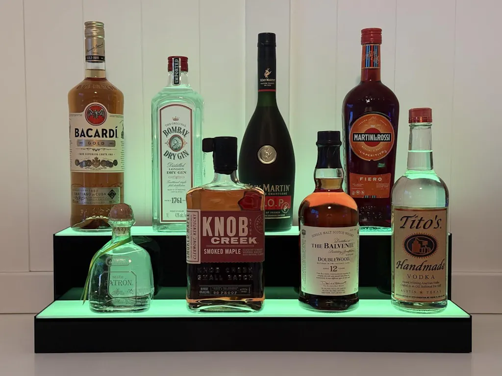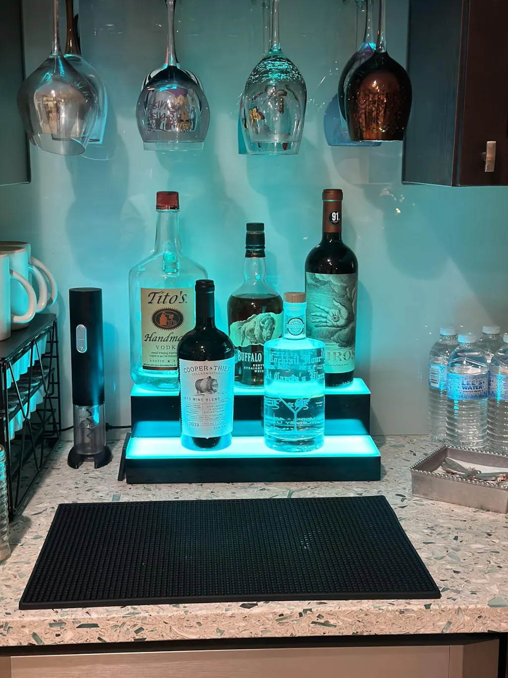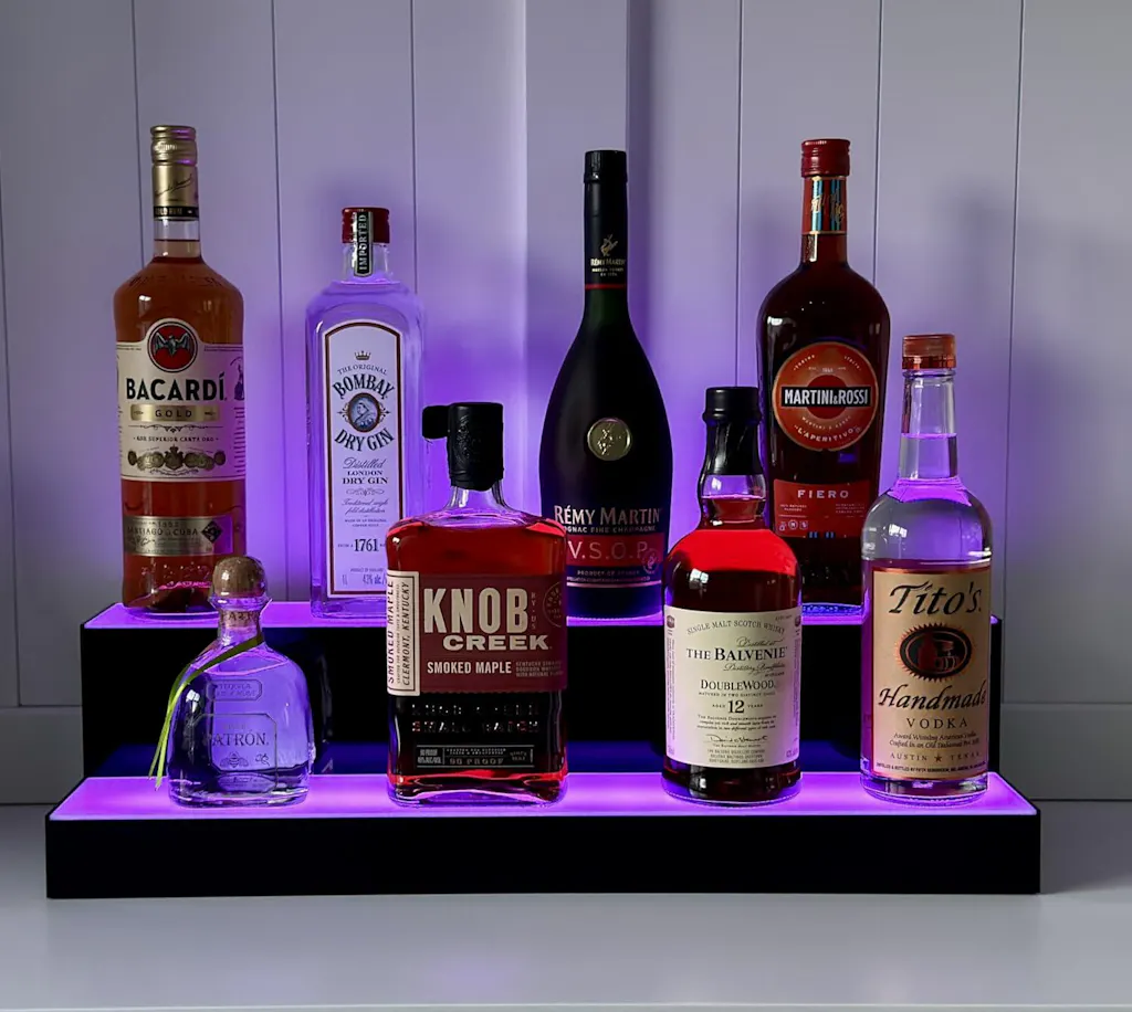 With its 33.66-inch width and 2-tier design, this display accommodates a variety of bottle sizes and shapes. The integrated wine holder slots not only secure your bottles but also activate mesmerizing lighting effects, drawing attention to your prized collection.