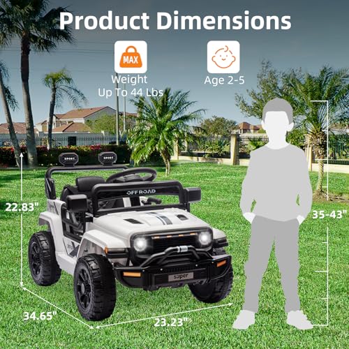 - 【Perfect Size】Featuring a cool outlook and realistic driving functions, our 12v ride on toys is a perfect gift for 3+ years old kids. OVERALL DIMENSIONS: 35"(L) x 23"(W) x 23"(H); WEIGHT CAPACITY: 44 lbs.