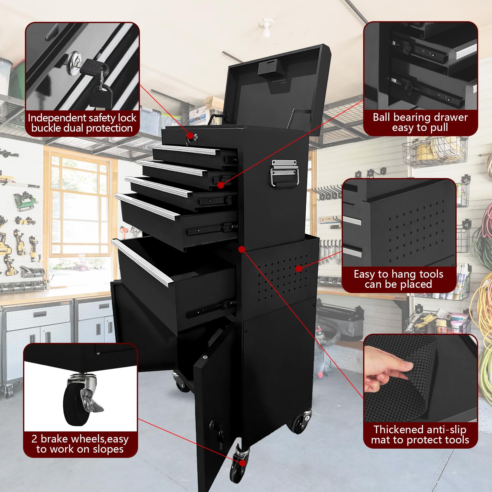 Garvee Rolling Tool Chest, 5-Drawers Metal Tool Chest Tool Box Organizer With Wheels, 2 In 1 Detachable Top Tool Cabinet, Sliding Drawers, Liners and Locking System for Warehouse, Garage, Workshop