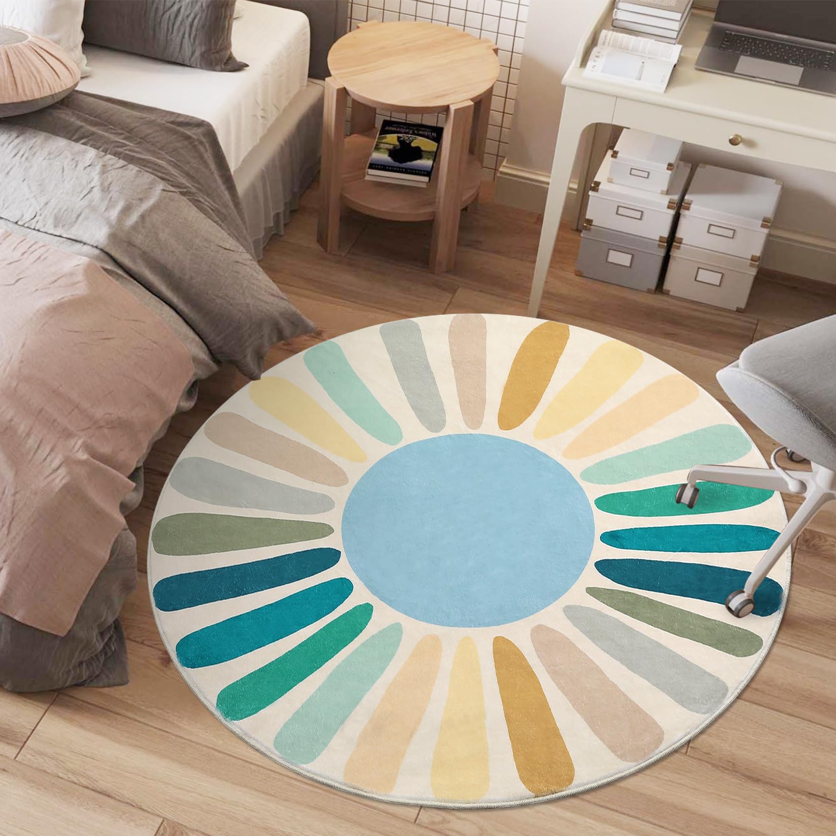 Garvee Round Rug 3ft Boho Retro Washable Circle Rug for Kids Room Sunrise Round Rug Non-Slip Throw Nursery Rug Colorful Throw Floor Cover Carpet for Living Room Bedroom Playroom, Blue