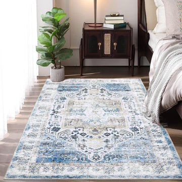 Garvee Area Rug 4x6 Washable Rug Vintage Print Rug Indoor Floor Cover Distressed Carpet Ultra Thin Rug Foldable Chenille Rug for Home Entryway Bedroom Living Room, Green, 4' x 6'