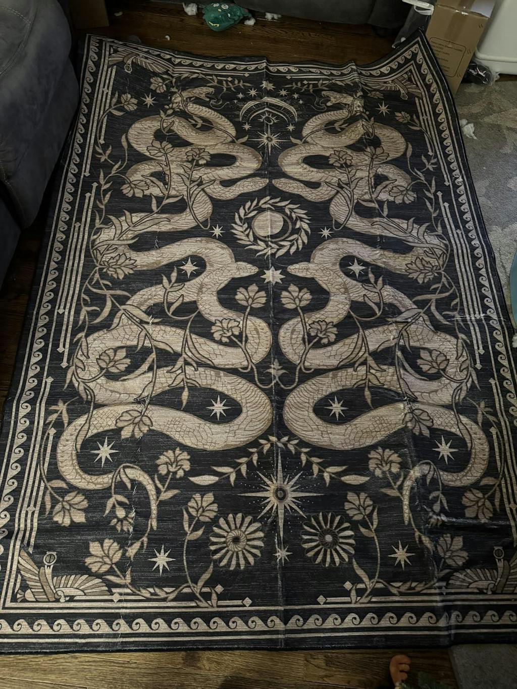 - 【Snakes and floral design】Featuring bold and stylized snakes intertwining with intricate forest floral elements, this design is complemented by a simple yet elegant decorative border. Variants of beiges ,green, and golds stand out beautifully against a deep black charcoal ground, creating a striking contrast. Water-resistant, stain-resistant, and machine-washable. Rug colors may vary slightly according to your device and the lighting in your space