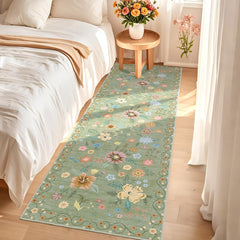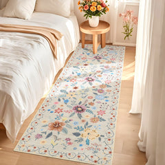 - Boho Floral Design: Elevate your home decor with this elegant and rustic floral rug. This area rug shows open blooms in vibrant shades of purple, blue, and yellow set against a multi-colored ground with botanical patterns. Its timeless design evokes a classic yet contemporary look, making it a perfect addition to any home space. Whether styled in your living room, bedroom, nursery, hallway, or playroom, this soft polyester rug adds a cozy and stylish touch to your home.