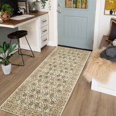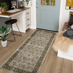 Beautiful rug! The dark green vintage pattern looks stunning in the room, and it’s soft with a low pile that’s easy to clean. The non-slip backing keeps it in place, and it brightens up the space without being too thick. Great quality and washable—love it!
