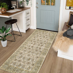 - Attractive Design: Featuring a distinctive floral pattern in shades of beige, grey-blue, dark green, and light green, this retro rug adds timeless style. It complements a range of color schemes and enhances any living area with its classic appeal.
