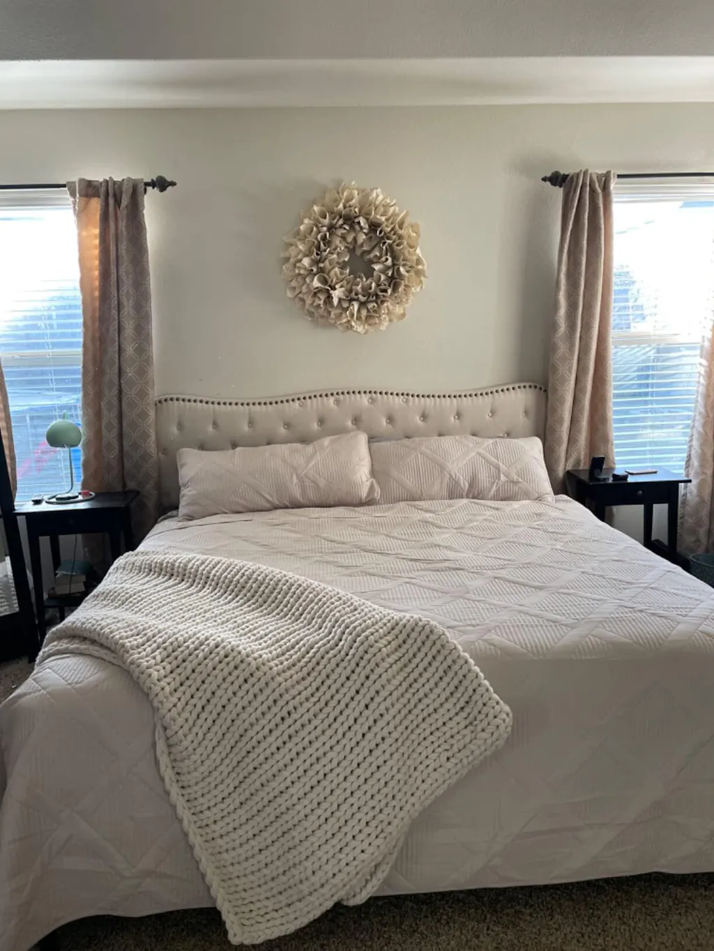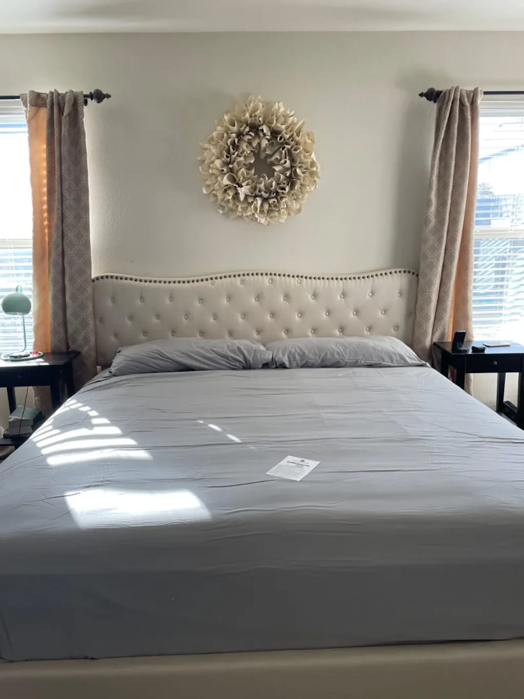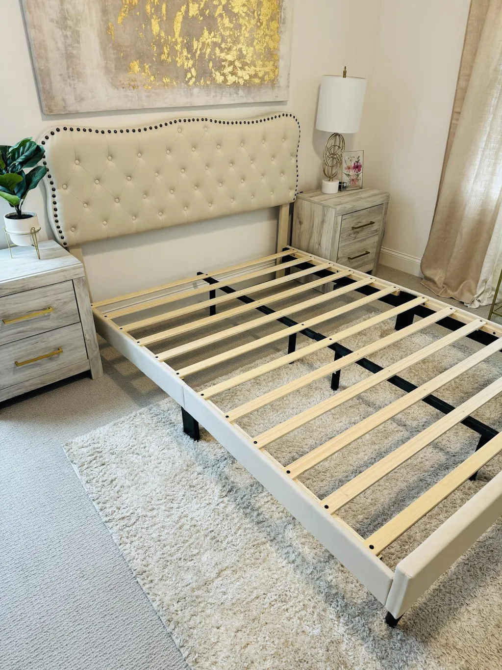 - MODERN DESIGN:Butterfly shape design is the biggest advantage of this full size bed frame. In addition, this upholstered bed frame is wrapped with premium linen and dense foam. Headboard is designed with metal rivets, and the elegant look lends a chic and subtle aesthetic that sets the tone for a livable and elegant bedroom.