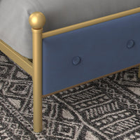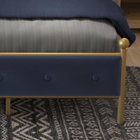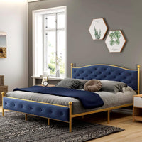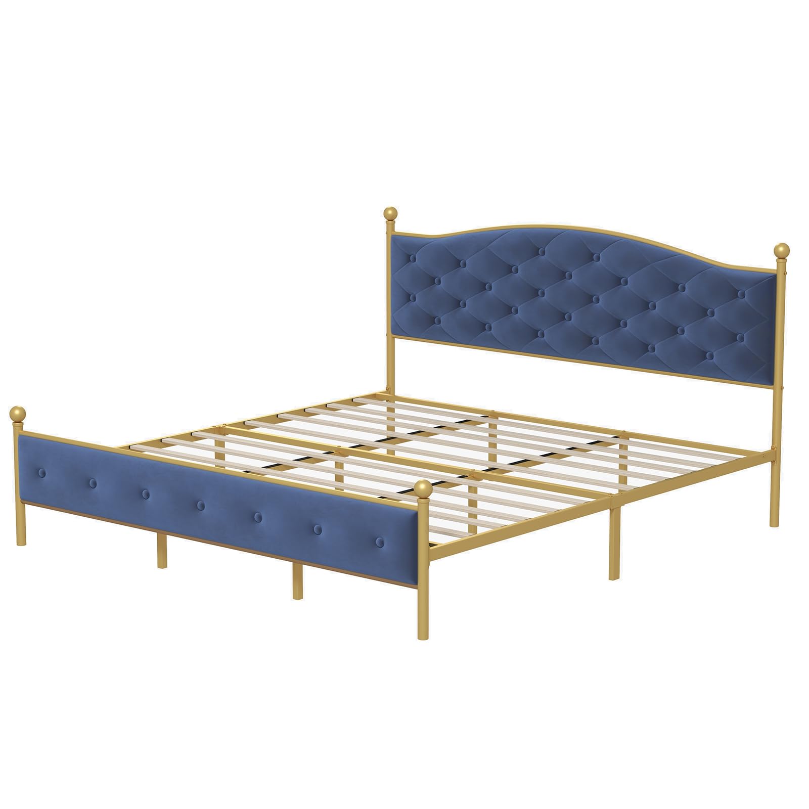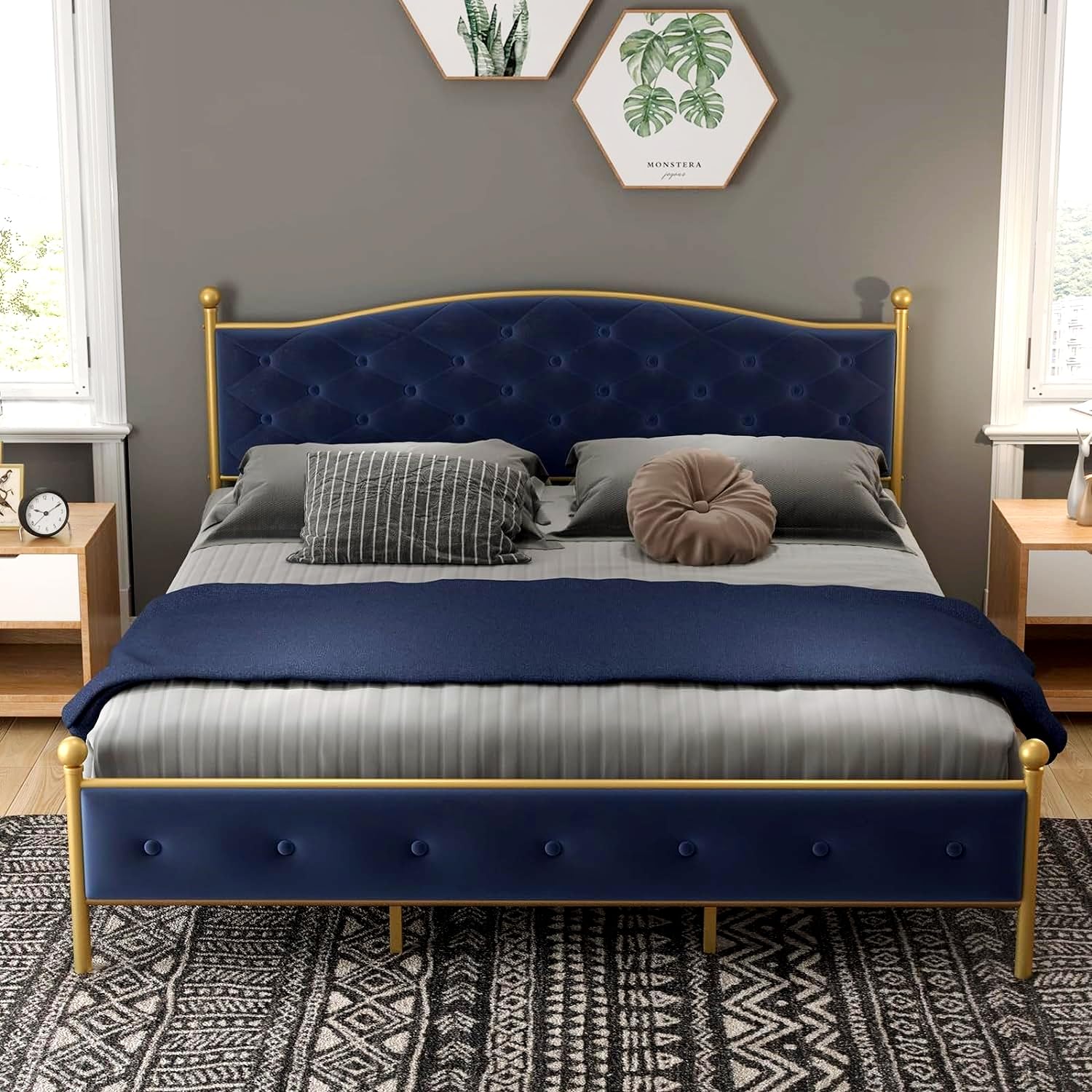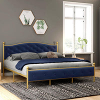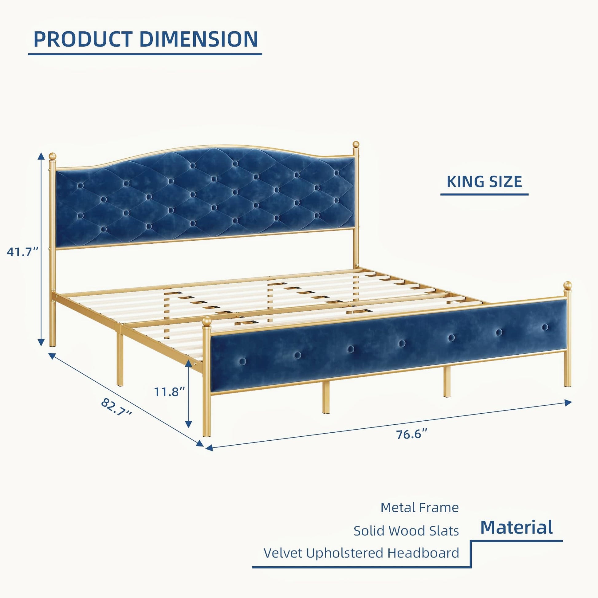 Garvee King Size Velvet Upholstered Bed Frame + Noise Free Design + No Box Spring Needed + Wooden Slats + Gold and Navy Blue + Storage Space + Easy Assembly