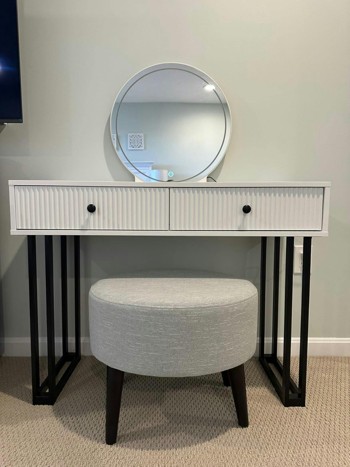 This vanity looks great in my corner, spacious enough for essentials. Putting it together was fairly easy, no wobbles or misalignment, and the LED mirror looks sharp with no warping. The drawers glide well, plenty of storage and the overall build feels well made. It doesn’t come with a seat, but adding your own is easy, and once set up, it really elevates the room’s look. Definite recommend from me!