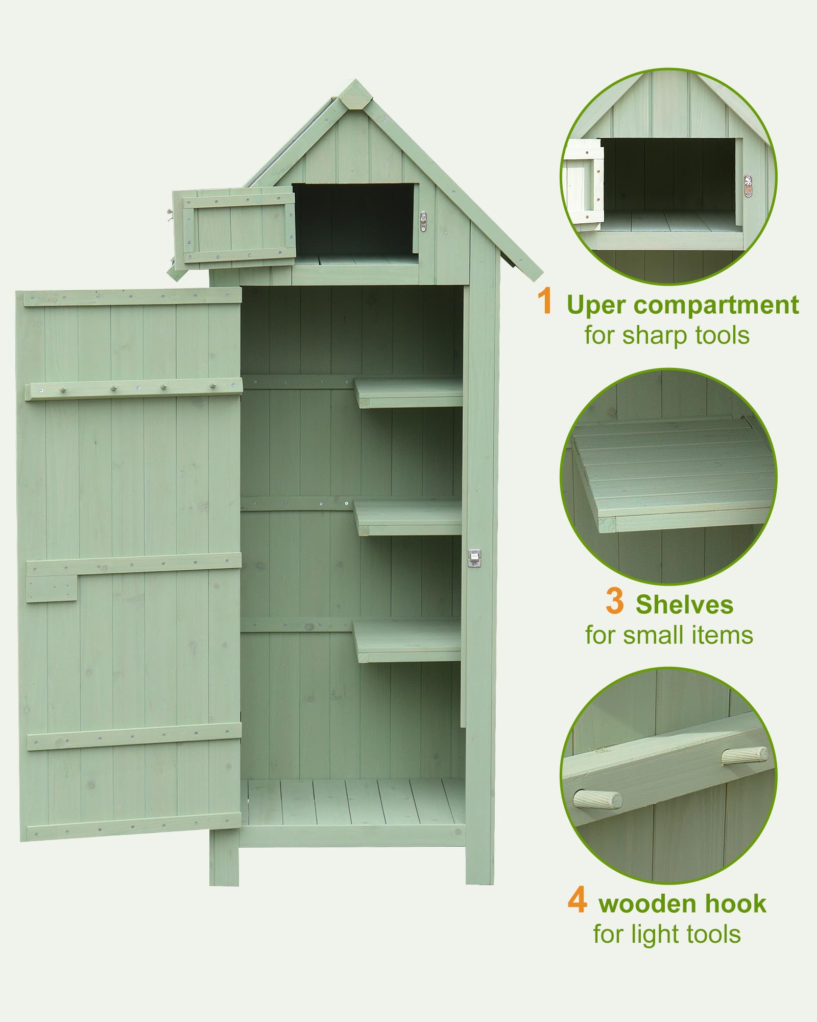 - Efficient Storage Design: This wooden sheds comes with a lockable door, removable shelves, the tool organizer is deal for storing different tools and accessories