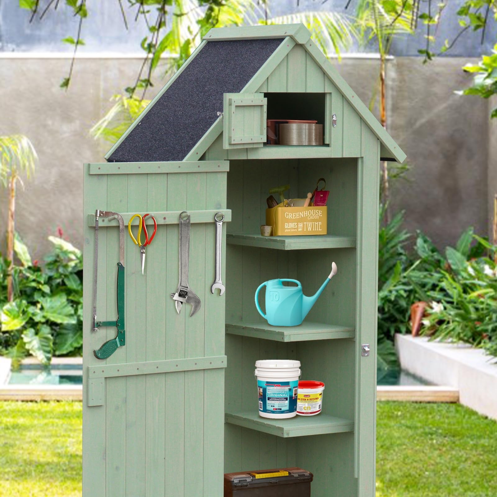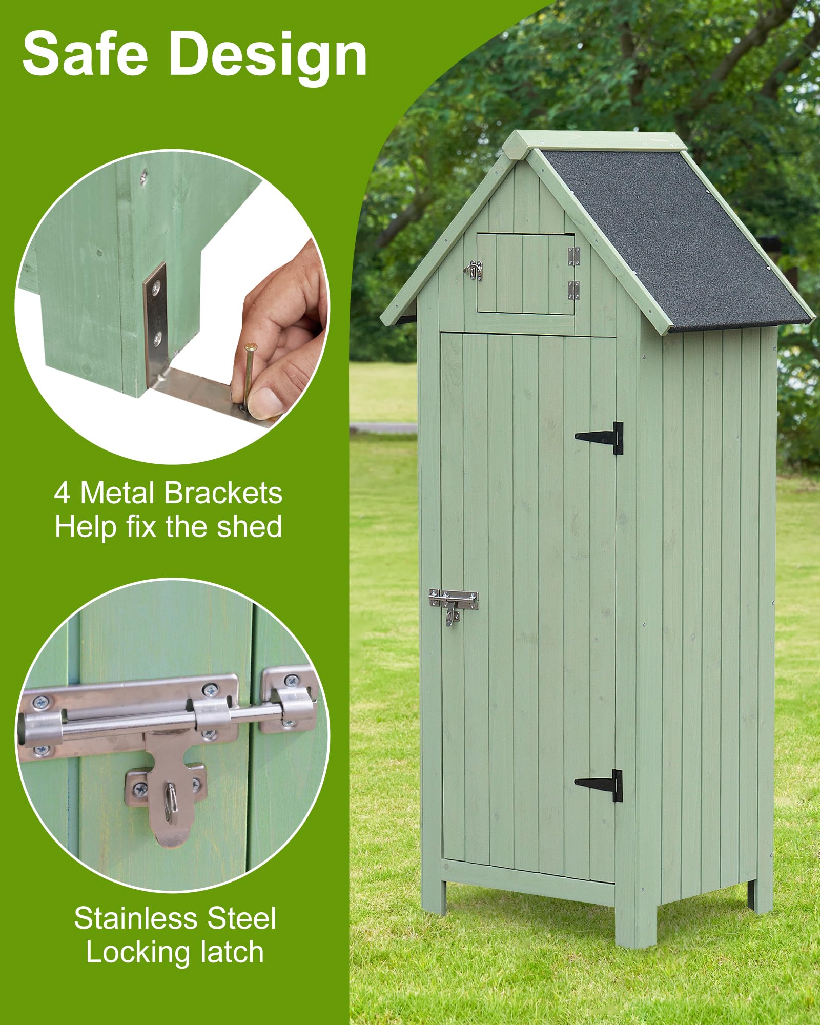 - Weather Proof Outdoor Shed: Featuring a sloped asphalt roof to ensure waterproofing and prevent water accumulation, extending the lifespan of the garden tool storage shed