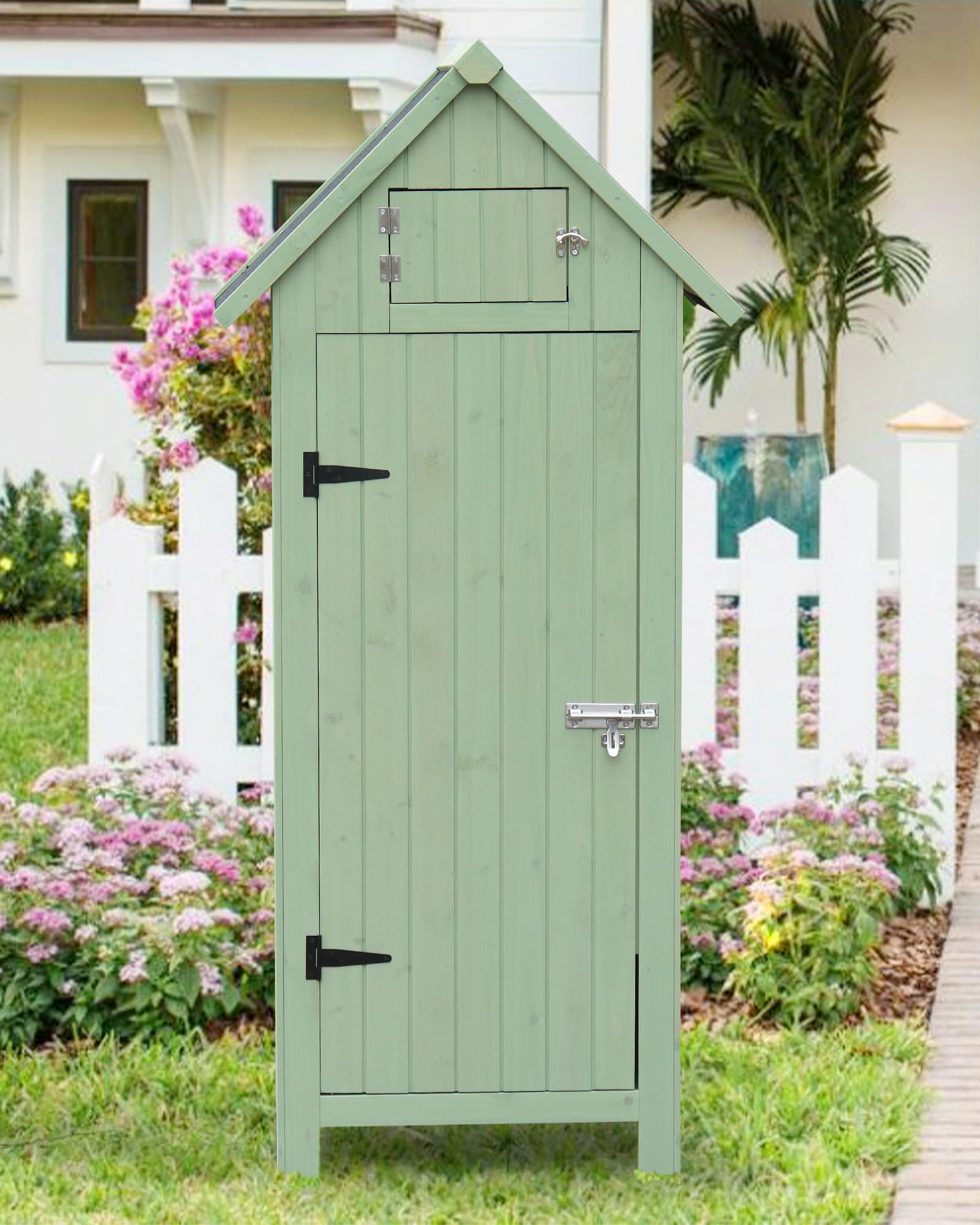 - Product Dimensions: The compact wooden storage shed occupies minimal space and is suitable for various settings, including indoors and outdoors, gardens, yards, porches, and garages. (Dimensions: 22.6 inches x 18.2 inches x 63.6 inches)