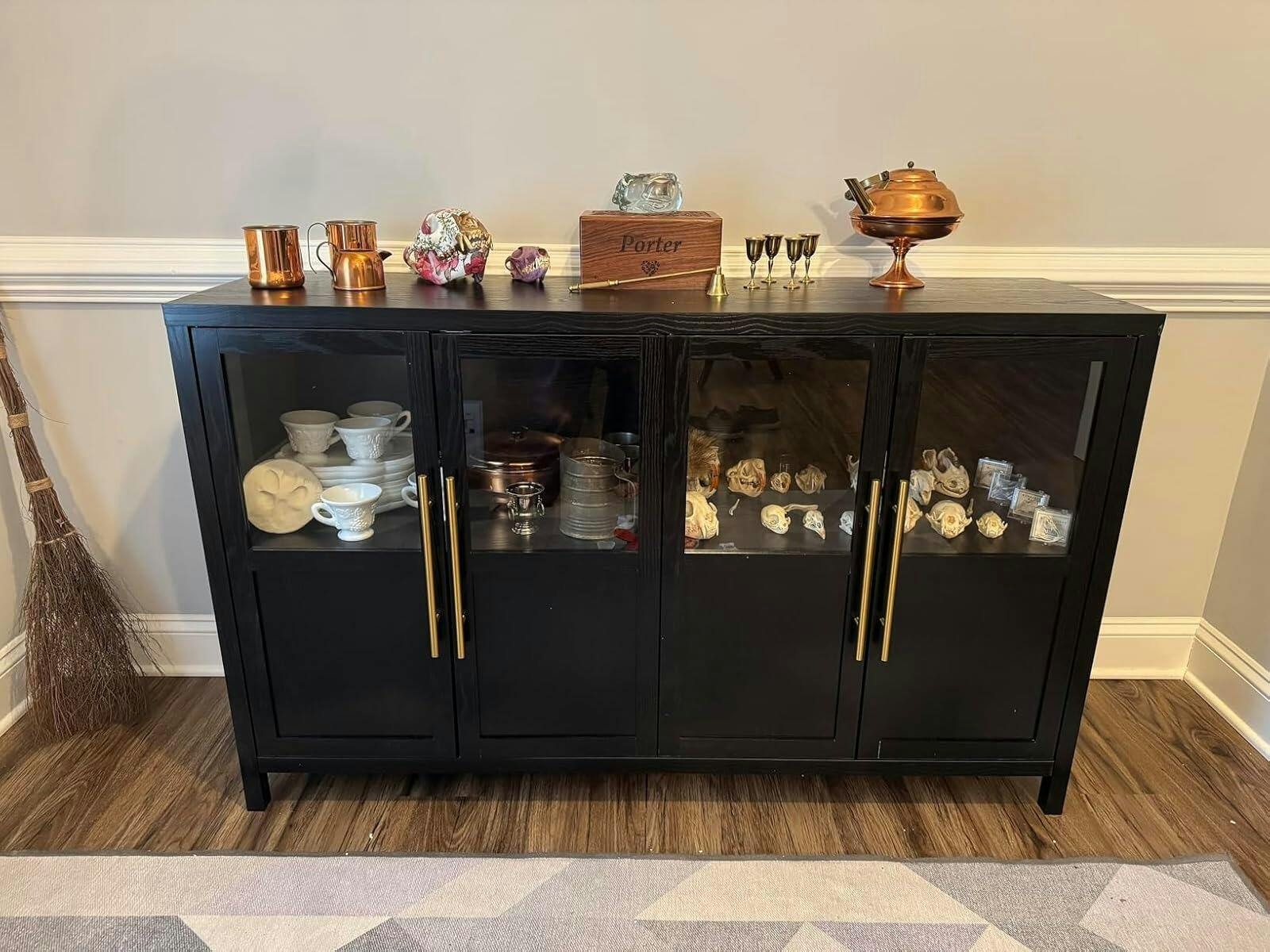 With its gleaming gold handles and transparent glass doors, this sideboard adds both flair and function to your dining room. Display your favorite dishes or decorative accents on the spacious shelves while keeping everything neatly organized and easy to access—perfect for entertaining guests or everyday family meals.