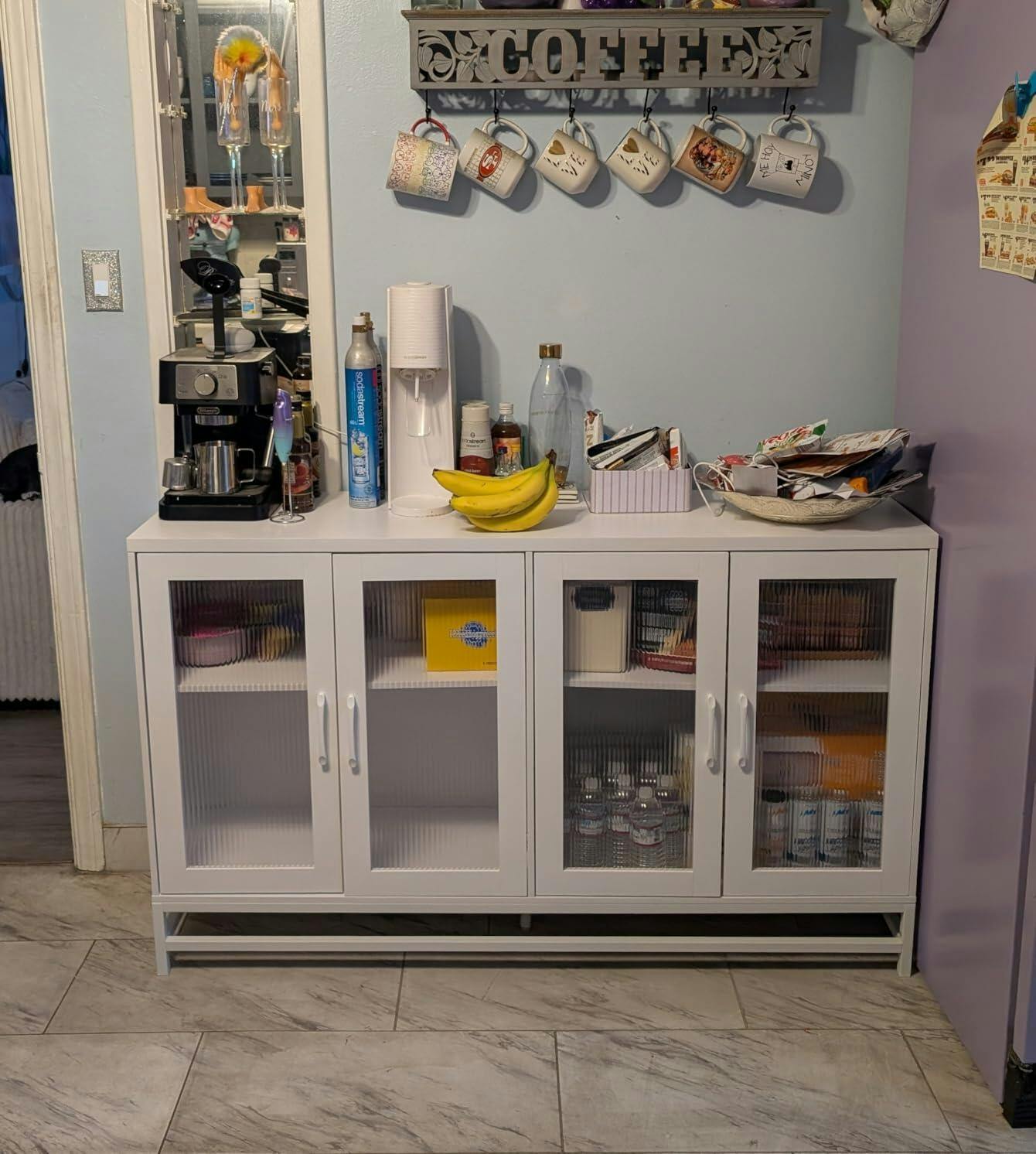 - BEAUTIFUL KITCHEN CABINET: This sideboard buffet cabinet features unique wood grain and fluted glass doors, Its sleek lines and minimalist contours create an inviting aesthetic, making it an ideal choice for both contemporary and rustic interiors